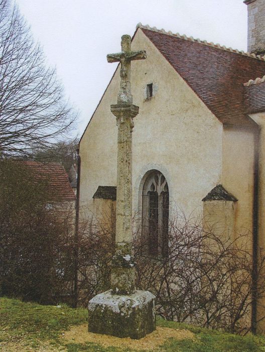 Croix élevée en 1677. D'après la tradition, elle constituait le but de processions effectuées lors des rogations, pendant les trois jours qui précédaient l'Ascension, pour attirer la bénédiction divine sur les récoltes et les animaux. Le premier jour était consacré au foin, le second à la moisson, le troisième aux vendanges. La croix est composée d'un fût de section hexagonale, posé sur une base de section carrée, d'un chapiteau à volutes d'ordre ionique et d'une croix de section carrée. L'ensemble est posé sur un piédestal carré, à arêtes supérieures chanfreinées. Les sculptures du fût représentent les instruments de la Passion, et illustrent les récits des Evangiles (la cruche avec laquelle Pilate s'est lavé les mains ; le coq du reniement ; le fouet de la flagellation...). Le chapiteau, de style naïf, rappelle l'ordre ionique avec ses volutes. Un Christ est sculpté sur l'avers de la croix.