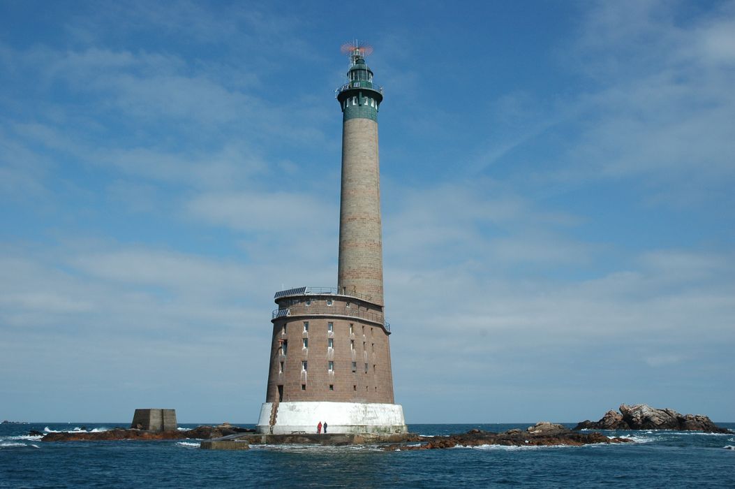 Ce phare, le dernier en mer construit en France et le plus éloigné des côtes européennes, est un ouvrage complexe de pierre et de béton, imprégné de références architecturales et maritimes. Entièrement détruit en août 1944 par les Allemands qui loccupaient, il est reconstruit dès 1947 et le feu est allumé en juin 1954. Lédifice est dune ampleur et dun confort inégalés pour un ouvrage de ce type et constitue une pièce majeure du programme de reconstruction des phares après la Seconde Guerre mondiale.