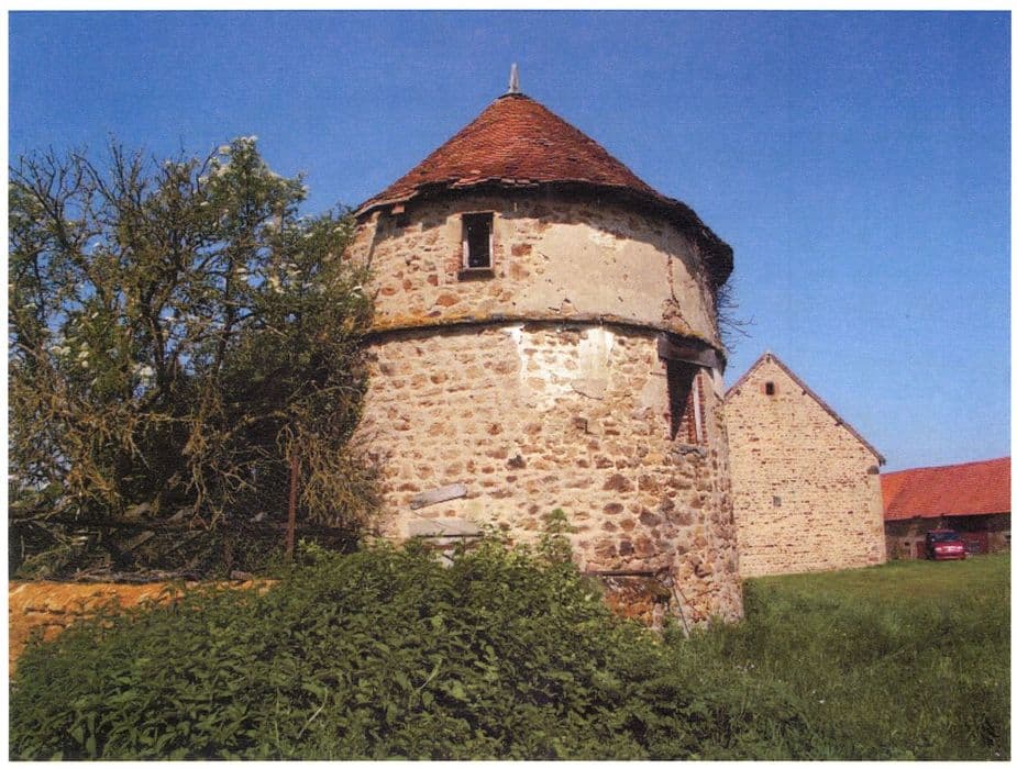Il s'agit d'un colombier à pied, à toiture débordante et recouvert de tuiles. Il dépend d'une habitation dont l'époque de construction remonterait très probablement au 15ème siècle, modifiée à de nombreuses reprises par la suite. Le colombier daterait également du 15ème siècle. Il est implanté dans la basse-cour, en limite sud-est. La porte, surmontée d'un linteau, possède des piédroits sculptés de motifs variés (fleurs de lys, têtes de personnages et têtes d'animaux). Des traces d'enduit sont encore visibles à l'extérieur et il subsiste encore un larmier ainsi qu'un épi de faîtage en métal. L'édifice mesure 5,5 mètres de hauteur et 8,5 mètres, toiture incluse et son diamètre intérieur est de 4,8 mètres. Une porte basse permet l'accès au premier et les 445 boulins, disposés en diagonale, sont exécutés en pierres. Le colombier a subi des transformations: une porte a été ouverte puis obstruée au nord, la baie d'accès pour les pigeons a été agrandie et entourée grossièrement de briques. La toiture, quant à elle, laisse apparaitre de sérieux désordres.