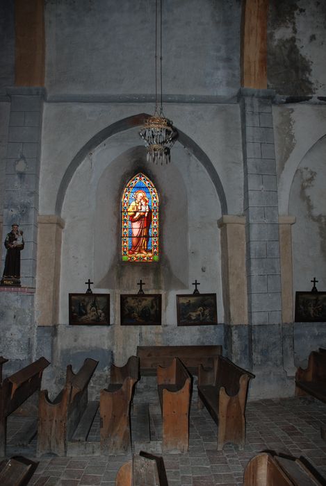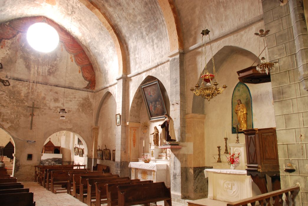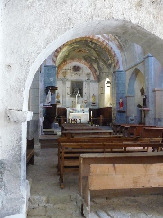 Cette église est mentionnée dès 1183. L'édifice, orienté, est composé d'une vaste nef se terminant par un choeur fermé par un chevet plat. Les assises sont réalisées en moellons calcaire et grès albien, la pierre de taille étant réservée aux encadrements et chainages d'angles. La nef se distingue par quatre travées, voûtées, des arc de décharge latéraux faisant office de contrefort. Des remaniements sont visibles : la première travée a été rabaissée suite aux évènements de 1380, les voûtes du choeur sont remontées au 17ème siècle, enfin, sur la façade sud, des baies sont créées. En 1830, la nef et le choeur reçoivent un décor peint. Un cartouche et des rosaces dans des caissons sur l'arc triomphal complètent cet ensemble peint