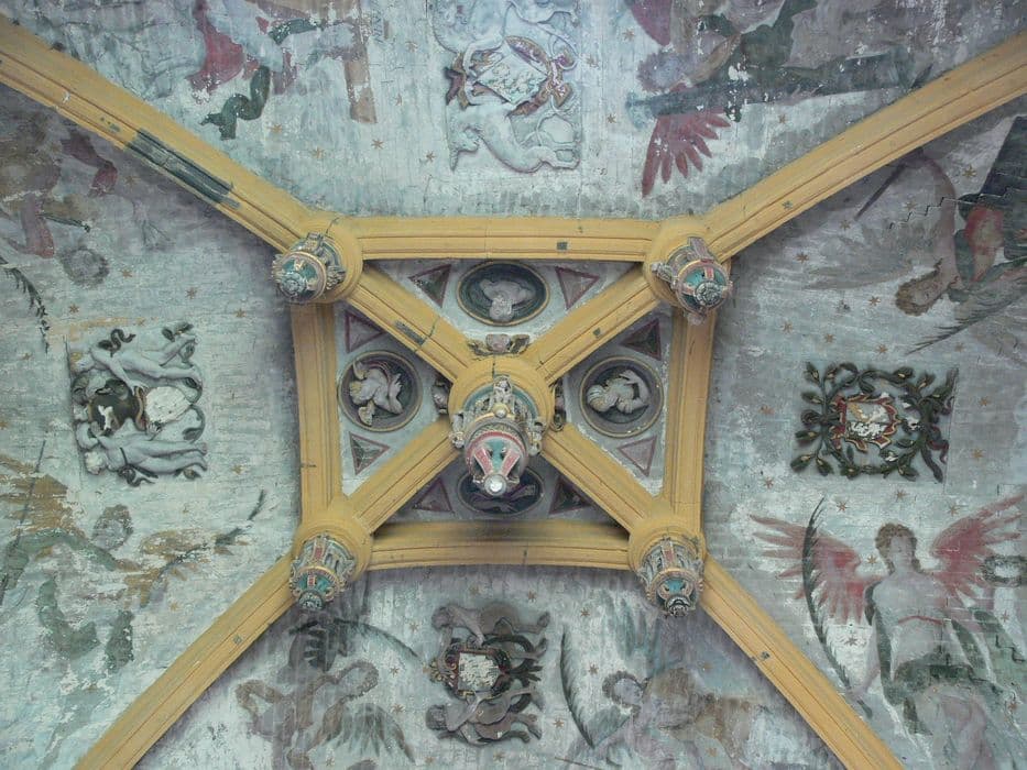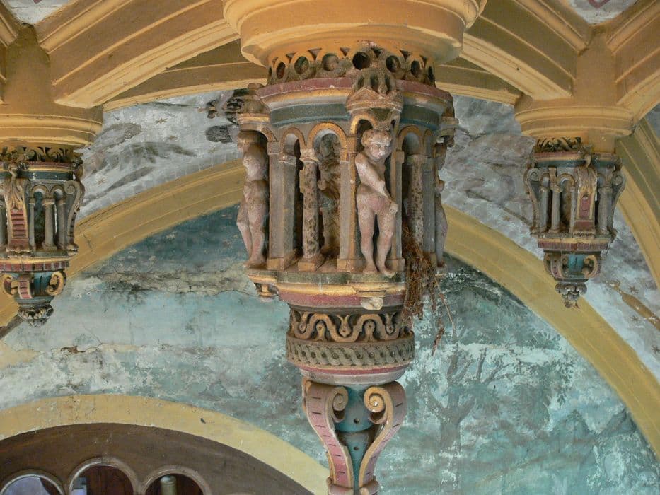 Eglise composée d'une nef accostée de deux chapelles. La chapelle nord s'orne de peintures couvrant l'ensemble des parois et de la voûte. Sur la paroi orientale se trouve un ensemble architectural et sculptural formé d'une rocaille abritant Marie-Madeleine pénitente allongée. Sur les parties hautes des murs se développe un ensemble peint formé de scènes historiées ( Jésus apparaissant à Marie-Madeleine ; Jugement dernier ; L'enfer ; le Christ aux outrages ; Saint-Michel terrassant le dragon). Sur les murs sud, ouest et nord, le décor est interrompu par un bandeau brun horizontal. Chacun des voûtains est peint de deux anges portant chacun une palme et un instrument de la Passion. Chacun des quatre vaisseaux centraux de la voûte est orné d'un médaillon en semi-relief polychrome constitué d'un personnage en buste. Les campagnes d'élaboration de l'ensemble décoratif, réalisé vers 1540-1550, sont au nombre de dix (pose de l'enduit blanc, puis de la litre funéraire ; mise en peinture des parois et des voûtes ; insertion de la rocaille ; le reste des campagnes servant à l'entretien).