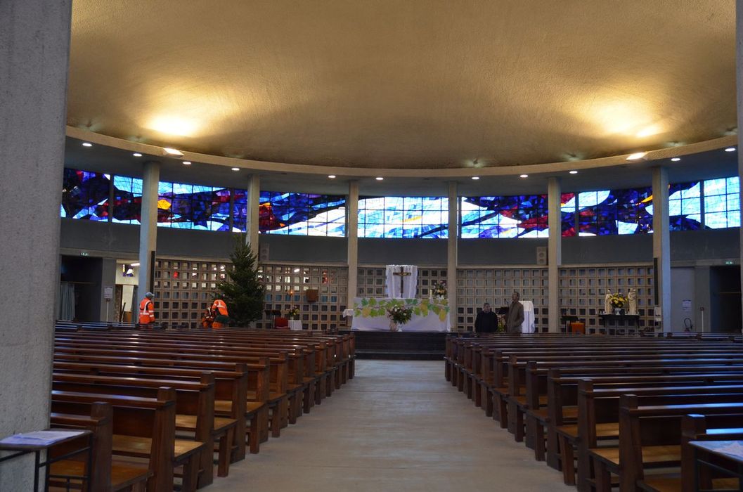 À l'intérieur de l'édifice, vingt piliers sont disposés en cercle à trois mètres du mur. Ces piliers soutiennent la voûte et tracent un déambulatoire autour de la nef. Une vaste verrière de 163 mètres carrés fait le tour de l'édifice. L'autel est légèrement excentré sur un podium en ardoises de schiste qui soulignent l'espace sacré et contraste avec la blancheur du béton. Le baptistère est situé dans une chapelle latérale à proximité de l'entrée principale. La chapelle du Saint-Sacrement, devenu sacristie, est intégré à l'arrière du chœur, séparée de celui-ci par un claustra de béton. Des salles de catéchisme prennent place sous l'église.