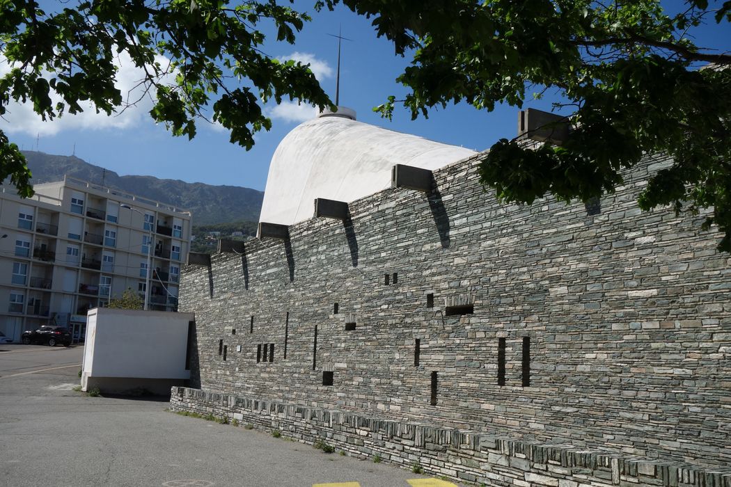Construite en 1969 sur les plans de l'architecte Louis de Casabianca, l'église s'inscrit dans le programme d'urbanisation dit "des grands ensembles" des quartiers sud de Bastia. L'architecte recourt au répertoire des formes alors en vogue : paraboloïdes hyperboliques, symboles de progrès technique et de modernité. A l'extérieur, l'édifice est limité par un volume rectangulaire en pierre d'où jaillit une grande forme s'élevant en coupole au-dessus du choeur, et se terminant par un oculus. L'entrée principale à l'est est précédée d'un escalier parvis et d'un large porche ouvert, abrité d'un voile parabolique. L'opposition forte entre un avant et un arrière se retrouve dans le choix de deux matériaux contrastés : le béton lisse et blanc et une maçonnerie grise et rugueuse de schistes. Le parti architectural est fortement symbolique, le béton blanc étant lié au ciel, la pierre donnant une assise terrestre à l'ensemble. L'aménagement des abords fait partie du projet initial, mais le parvis a été réalisé ultérieurement et le clocher n'a jamais été construit.