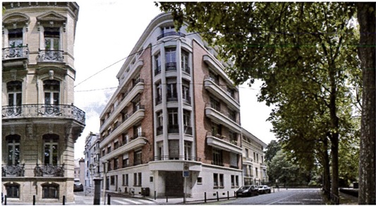 Comptant cinq étages, les façades sur rue font alterner la brique rouge et les parties enduites blanches (soubassement, balcons, attiques, travée d'angle). L'entrée principale est placée au niveau de l'angle traité en arrondi et percé par une série de baies tripartites. L'horizontalité des balcons filants contraste avec la forte verticalité de cet angle. Le dernier étage qui ne couvre qu'une partie de l'immeuble est en attique et souligne encore l'angle.