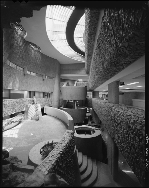 le parti-pris d’immeubles cruciformes prévalant dans le quartier, construit un édifice constitué de plateaux circulaires successifs, créant une impression de densité et d’irrégularité accentuée par l’inclinaison des murs et le parement de pierre des parois. A cet extérieur répond à l’intérieur une organisation de l’espace reposant sur un jeu de courbes et de contre-courbes et que magnifie un vaste atrium central.