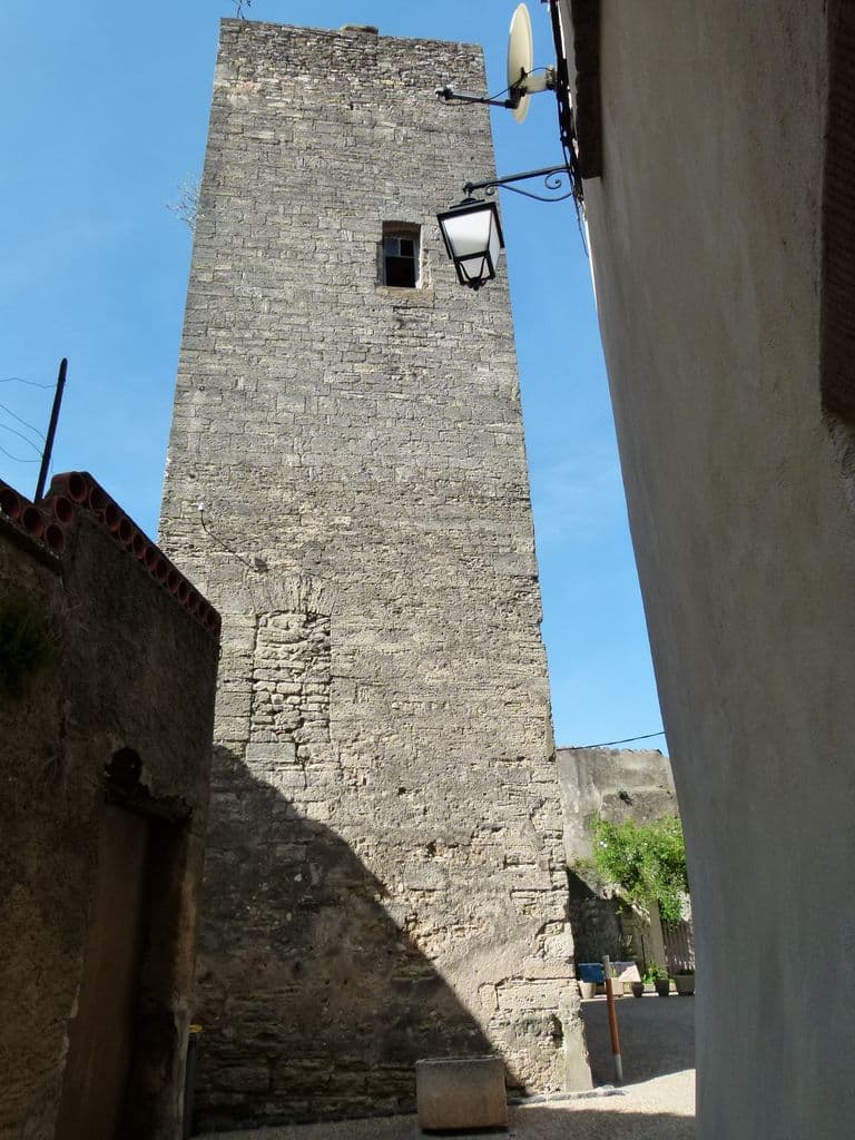 Il sagit dune tour-beffroi datant du 12ème siècle. Elle assumait un rôle de surveillance mais aussi symbolique comme affirmation du pouvoir seigneurial. La fonction dhabitat y est quasiment nulle et les surfaces réduites et exigües. Cette tour possède trois niveaux voûtés en berceau : le premier niveau servait habituellement de stockage. Laccès aux deuxième et troisième niveaux se faisait, à lorigine, par la porte haute de létage (aujourdhui murée). La terrasse sommitale supporte le campanile et sa cloche. Au 17ème siècle, la tour fut utilisée comme grenier à sel et, au 19ème siècle, une horloge mécanique fut installée.