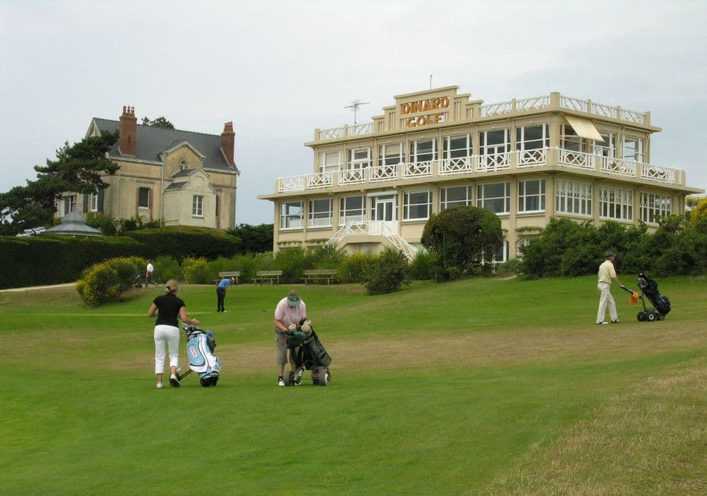 Le golf est officiellement créé en 1890 par la communauté britannique de Dinard. Au premier club-house en pierre, bois et ardoise édifié en 1892, succède, en 1927, lactuel bâtiment de style Art Déco. Dabord établi sur deux niveaux, il est, par la suite, couvert dun toit-terrasse abritant un bar-restaurant. Lédifice adopte une structure simple, à planchers et poteaux de béton, et est éclairé par de larges baies. Deux enseignes sinscrivent en lettres géométriques dans les frontons ajourés des garde-corps, dominant lensemble de la construction.