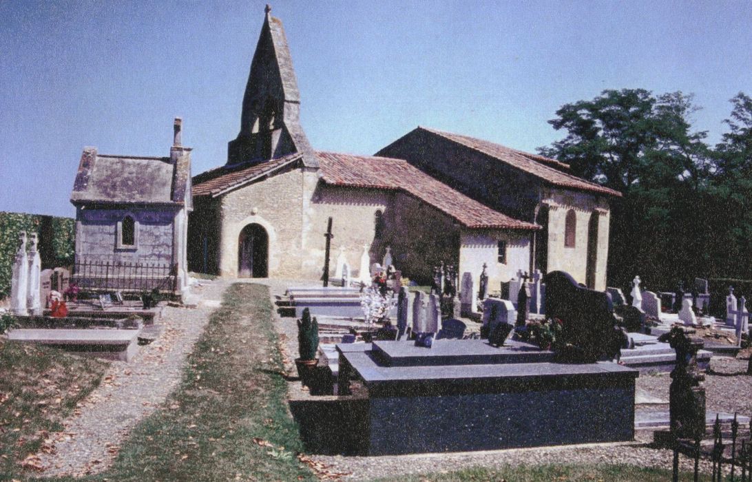 Eglise bâtie aux 11e-12e siècles sur l'emplacement d'un établissement antique dont elle remploie les matériaux. Après les démolitions dues aux guerres de Religion, l'église a été restaurée. L'édifice se compose d'une nef unique et d'un chevet à trois absides. A l'ouest, le clocher-mur pignon percé de deux baies campanaires, est précédé d'un porche qui s'ouvre dans le cimetière sud. L'appareil d'époque romane sur le chevet présente des marques de tâcherons ainsi que des graffiti.
