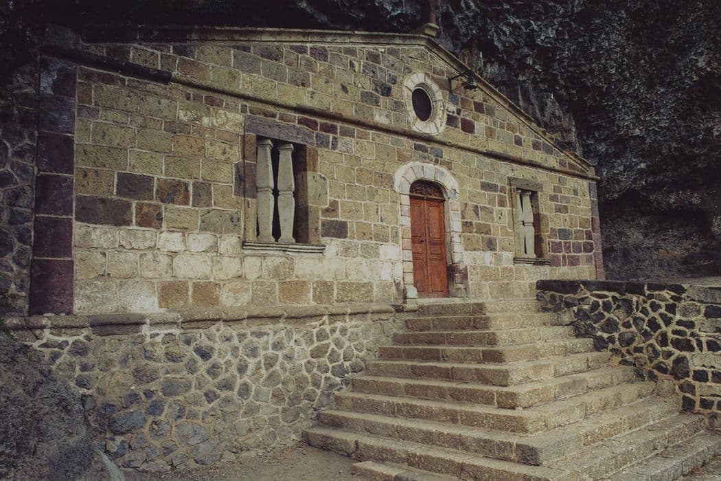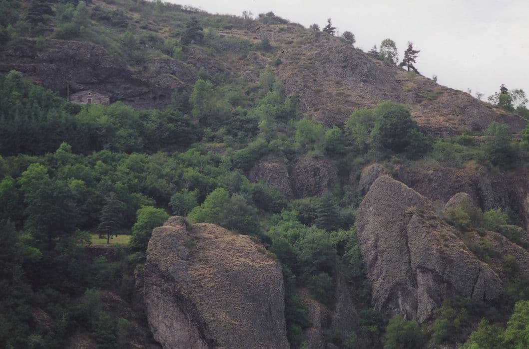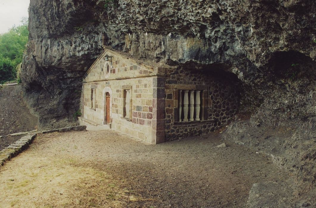 L'histoire de cette chapelle troglodytique et du culte s'y rattachant s'appuie avant tout sur une tradition plus ou moins légendaire. Une femme originaire de Saint-Alban empruntait un petit chemin longeant une grotte pour se rendre au Puy. En passant, elle aperçut une image de Sainte-Madeleine tenant une tête de mort. Croyant qu'elle avait été perdue par quelqu'un, elle la prit et la mit dans un livre, mais aux voyages suivants elle trouva la même image. Elle fit alors le voeu d'installer un oratoire à Sainte-Madeleine dans cette grotte si elle gagnait le procès qui la conduisait régulièrement au Puy. Un autre récit veut qu'un gouverneur du Puy passant par ce chemin fut désarçonné de son cheval et sauvé d'une chute dans le précipice par une prière à Sainte-Madeleine. En reconnaissance de ce miracle, il aurait fait construire devant la grotte une façade en pierre de Langeac avec fenêtres. Par ailleurs, un traité de 1312 mentionnerait la fréquentation de cette grotte depuis le 13e siècle, avec l'enterrement des fidèles à côté. Les archives notariales mentionnent des donations testamentaires pour faire dire des messes ou réparer la chapelle, entre 1682 et 1781. Au cours des fouilles effectuées en 1872 et 1873 sur les sépultures environnantes, des pièces de monnaies ont été trouvées, majoritairement datées de 1615 à 1631. ££Le culte de cet oratoire semble directement issu de celui de la Sainte-Baume, où les restes de la sainte seraient restés enfouis avant d'être découverts par Charles d'Anjou en 1280, à la fois par la tradition orale et par l'existence autrefois de la maquette de la montagne conservée dans la chapelle. Il est probable que l'origine du culte est dû à un fidèle de la région revenant d'un pèlerinage à la Sainte-Baume. Une datation médiévale pourrait s'appuyer sur le texte de 1312 qui mentionnerait la chapelle. Cependant, les éléments concrets retrouvés sur place permettent de confirmer l'existence du culte au début du 17e siècle (tombes, monnaies, legs). ££Un bâtiment devait exister au 17e siècle. Le style néoclassique de la façade a été utilisé surtout dans la deuxième moitié du 18e siècle, et dans la région jusque dans les années 1840. Les balustres sont d'un modèle caractéristique du 17e siècle, mais peuvent également être des réemplois. La chapelle se présente comme une façade fermant une cavité rocheuse. Au centre, une porte s'inscrit dans un encadrement à bossage à couvrement en anse de panier. Des battants en pin décapé et clouté ferment cette porte. Des moulurations droites délimitent six panneaux rectangulaires. Au-dessus d'une traverse dormante, un tympan plein en bois épouse l'encadrement surbaissé. Il est orné de motifs sculptés dans la masse. Deux baies de part et d'autre de la porte éclairent la nef. Au-dessus de ce niveau, un fronton triangulaire, percé en son centre d'un oculus, est occulté par un vitrail protégé par un grillage. Au sommet du fronton est fixée une petite croix en tuf rouge sur un petit socle en pierre. Des traces de peinture apparaissent sur certaines pierres. A l'intérieur, la nef parallèle à la façade et chapelle dans la profondeur côté ouest.