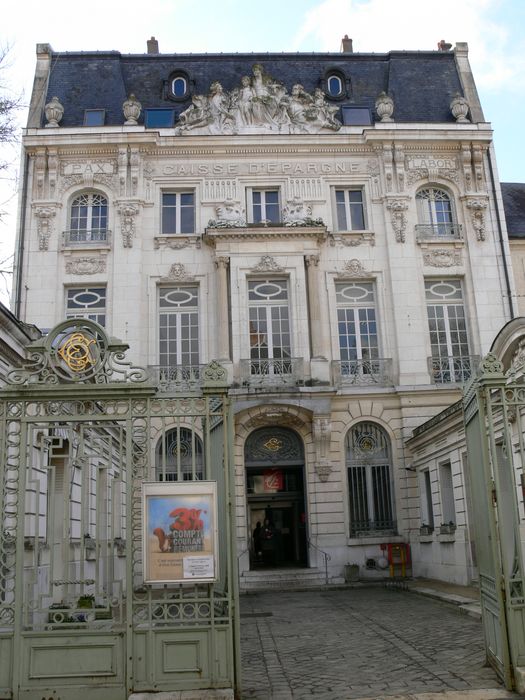 L'hôtel de la Caisse d'épargne d'Orléans a été élevé entre 1910 et 1912 à l'emplacement de l'ancien hôtel de Geffrier. Construit entre cour et jardin, l'immeuble est relié à la rue par deux ailes en retour d'un seul niveau couvertes en terrasse. L'immeuble principal présente une ornementation ostentatoire : guirlande, têtes de lions à la base des consoles, colonnes cannelées, mascarons au centre des linteaux ou des arcs des fenêtres. Des inscriptions sont disposées au sommet de l'élévation ; elles mentionnent la qualité de l'institution (Caisse d'Epargne) , mais aussi les valeurs qu'elle renferme (Paix et Travail). Si la façade a été bien conservée, il n'en va pas de même pour l'organisation interne. Seule la verrière qui couvrait la salle d'accueil du public et les arbalétriers qui soutenaient la partie oblique du toit sont encore en place. Le reste du décor a disparu lors des transformations dans les années 1970. La façade de la Caisse d'Epargne d'Orléans est représentative du groupe des hôtels de Caisse d'Epargne qui s'inscrivent dans la continuité des hôtels particuliers - la position de l'édifice le rappelle. Le traitement de la façade, le vocabulaire architectural dénotent un certain éclectisme du Conseil des directeurs et un choix original indéniable. Sa monumentalité la rapproche toutefois de l'architecture bancaire de la fin du 19e siècle ou du début du 20e siècle.