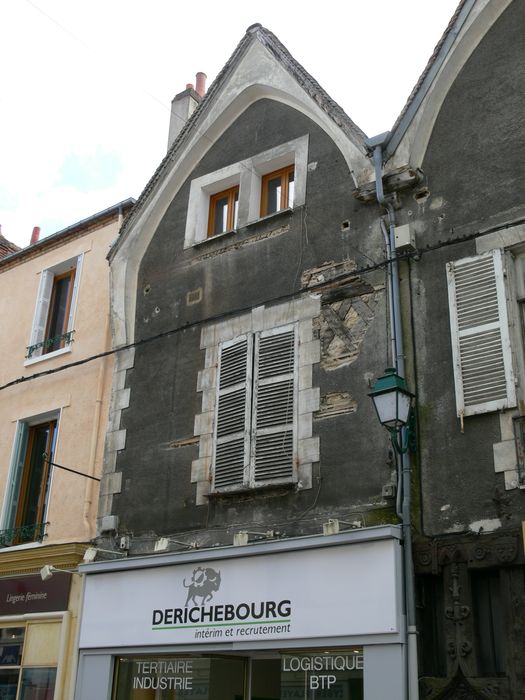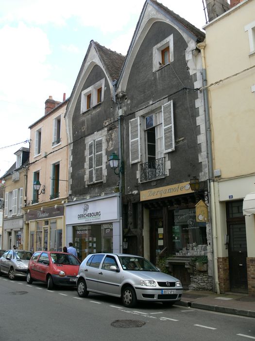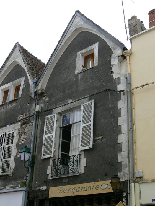 Les façades se composent d'une ossature en pan de bois disposé en treillage losangé. Cette façade écran, insérée dans des murs latéraux en maçonnerie, s'ouvre par une porte au décor flamboyant composé de volutes et de feuillages stylisés. Cette porte centrale est flanquée d'une porte latérale à droite qui donne accès à la boutique. Il devait en être de même pour la boutique de gauche. La porte centrale donne accès à un couloir qui dessert l'escalier disposé à l'autre extrémité de l'édifice, faisant entrer l'ensemble dans la catégorie des maisons à double logis, disposition autrefois sans doute assez courante. La maison a conservé sa structure jumelée extérieure et ses dispositions intérieures. Outre la porte flamboyante, l'édifice a également conservé les trois portes de pierre à arc surbaissé de sa cage d'escalier.