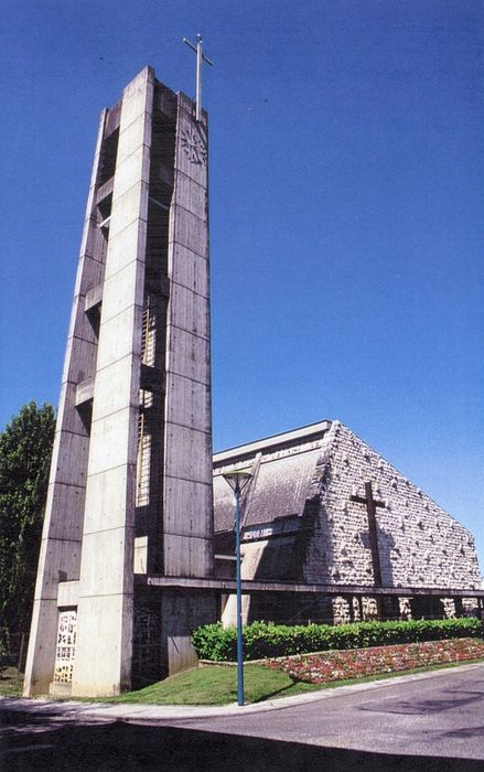 Léglise est bâtie de 1960 à 1965 par Jacques Pompey. Cet édifice rectangulaire est la base dune composition durbanisme en forme de U, dont les immeubles collectifs forment les ailes. Un portique relie léglise à un clocher isolé. Le décor extérieur se compose, côté est, de lits réguliers de pierres de taille grossièrement équarries, parsemées de bossages. A lintérieur, le béton a été sablé, conservant les traces du coffrage. Les verrières sont constituées de verres éclatés. La charpente apparente est soutenue par des contrefiches en lamellé-collé disposées en faisceaux.