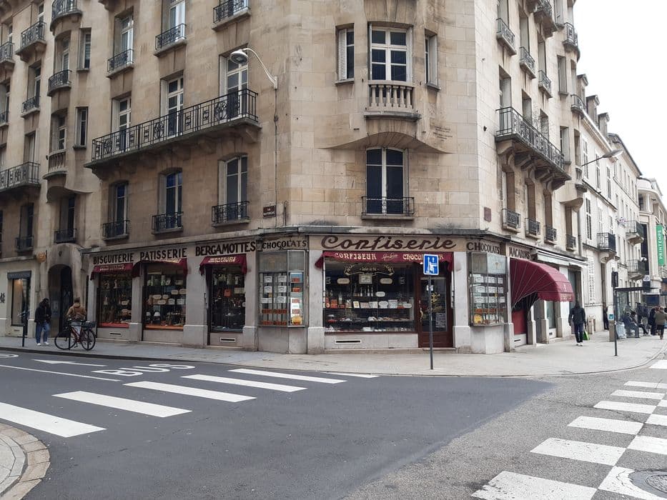 Les devantures, y compris les étagères garnissant les vitrines, des deux vitrines d’applique extérieures, du mécanisme de pare-soleil extérieur et de l’ensemble des lambris garnissant la boutique et le salon de thé de la confiserie Lefèvre-Lemoine, située 47 rue Henri Poincaré sur la parcelle 293 figurant au cadastre section BY, lot 26 de la copropriété, conformément au plan annexé à l’arrêté : inscription par arrêté du 9 octobre 2024