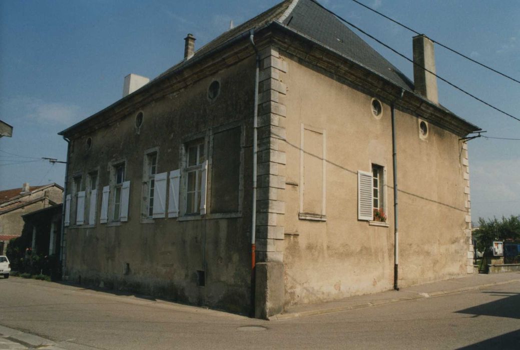 "Au milieu du 18e siècle, Dom Calmet relevait que "le roi (Stanislas) est seul seigneur de la partie qui est du comté de Ligny et M. du Tertre est seigneur de l'autre partie, qui a le titre de baronnie et ci-devant de prévôté, du baillage du Bar (...). Le roi et M. du Tertre y ont chacun un château". Conseiller et avocat général à la Chambre des Comptes de Bar, François Vyart devint conseiller d'Etat et procureur général à Bar. C'est à ces titres que, les 26 et 27 décembre 1721, le duc Léopold érigea en sa faveur Tronville en Baronnie. Parmi ses enfants, Thérèse épousa vers 1720 Charles du Tertre, conseiller au Parlement de Metz (1693-1747). C'est certainement à l'initiative de Charles du Tertre, alors âgé de 39 ans que fut élevé, en 1732 (date porté au fronton) le château actuel. Thérèse Vyart lui survécut de longues années, puisqu'elle décéda en 1782. De leur fils Antoine-Louis, disparu en 1789, le château passa à Jean-Baptiste-Nicolas-Louis du Tertre, émigré en 1790 pour décéder à Port-au-Prince en 1796. Vendu comme Bien National en 1795, le château fut racheté le 20 février 1859 par la commune qui en fit un presbytère, puis une perception, jusqu'à ce que la mairie s'y installe enfin, le 2 novembre 1983. Précédé par une cour longtemps bordée d'une entrée monumentale dont subsiste un pavillon, le château est un corps rectangulaire d'un niveau unique, couvert d'une haute toiture d'ardoises à croupes. Sa façade principale, au nord-est, est construite en pierre de taille que percent quatre hautes fenêtres au linteau en arc segmentaire, encadrant un avant-corps central à fronton triangulaire de trois baies en plein cintre, que précède un escalier à deux volées latérales. L'ordre toscan des pilastres, soutenant un entablement bombé, les agrafes en mascaron à têtes féminines des baies et la date "1732" en petits chiffres espacés agrémentent cette noble façade. Les autres façades, en moëllons crépis, sont plus sobrement traîtées. Au nord-ouest, sur cour, un corps de dépendances de deux niveaux de fenêtres rectangulaires prolonge le logis. En ce qui concerne les intérieurs, trois pièces ont conservé leur caractère, représentant les deux tiers de la superficie du rez-de-chaussée : - le vestibule central, avec son dallage blanc à bouchons noirs, ses lambris et son plafond décorés de neuf panneaux peints, oeuvre du peintre Louis Yard. - le salon lambrissé contigu, avec sa cheminée et son grand panneau peint, oeuvre du même artiste. - la salle-à-manger, lambrissée de panneaux rectangulaires, avec sa cheminée du début du 19e siècle. Les dix toiles, ainsi qu'une fontaine en faïence armoriée ont été classées au titre des objets le 28 mars 1980."