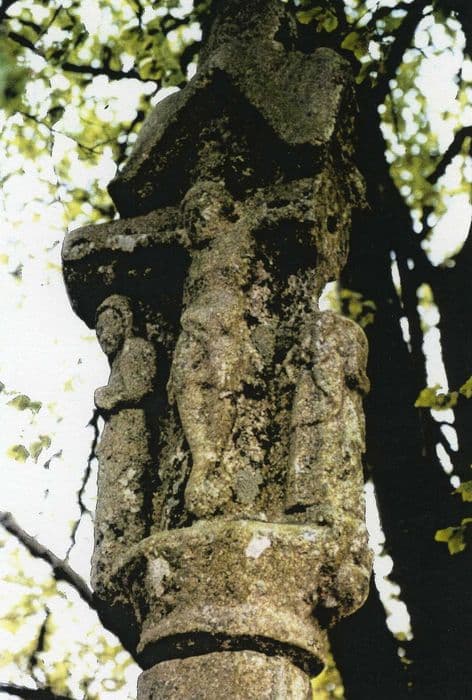Cette croix est datée du 15e siècle. Le socle porte la date 1804 (date de la restauration). Les représentations sur les deux faces de cette croix sont de qualité : d'un côté, le Christ en Croix flanqué de la Vierge et de Saint-Jean, et, de l'autre côté, la Vierge à l'Enfant couronnée.