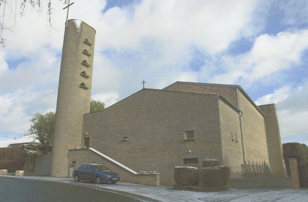 Les premiers projets pour l'église datent de 1956. L'édifice reste traditionnel par son plan rectangulaire et ses matériaux (moëllons de calcaire jaune). Son originalité tient à l'élévation conçue pour créer un éclairage indirect de la nef. Celle-ci repose sur des piliers implantés dans la crypte et semble en suspension car son plancher ne touche pas les murs gouttereaux. Le plafond suspendu fait écho à ce plateau. Cette structure permet le passage de la lumière naturelle depuis les bas-côtés de la crypte, la toiture et deux colonnes de pavés de verre de part et d'autre du choeur. Le mobilier liturgique a été dessiné par l'architecte.