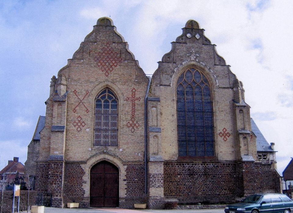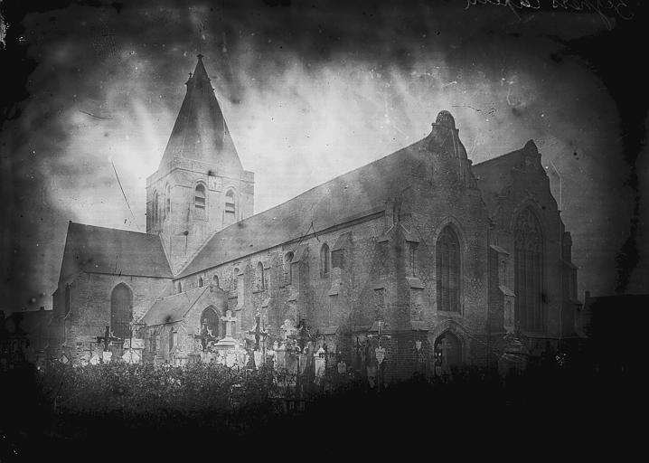 L'origine de l'église actuelle remonte au 12e siècle. C'était un édifice d'une nef, flanquée d'étroits collatéraux avec transept saillant, surmonté d'un clocher sur une tour carrée à la croisée. L'édifice prend ensuite la forme d'une croix latine et, sur la croisée, se dresse la tour carrée en calcaire de Saint-Omer. Sous Charles-Quint, une nef sud vient se souder au croisillon droit du transept. Cet agrandissement partiel devait faire partie d'un projet d'ensemble consistant à adjoindre deux nefs au vaisseau primitif. Incendiée et ravagée par les Gueux, l'église était ruinée en 1585. Restauration de 1614 à 1633. Les deux pignons à courbe et contre-courbe de la façade occidentale, transformés à cette époque, donnent à cette église son caractère original et unique en Flandre. Nombreuses restaurations au 19e siècle. Le peintre verrier Louis Koch réalisa plusieurs vitraux en 1903-1905.