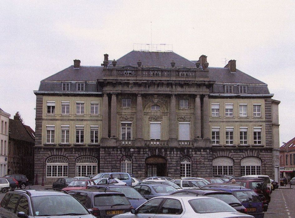 A l'origine, il s'agissait d'un hôtel de ville occupant tout le corps central, encadré de deux ailes occupées par des maisons particulières finalement absorbées par la fonction administrative au cours des 19e et 20e siècles. La responsabilité de la maîtrise d'ouvrage était répartie entre la ville et le roi, avec l'intervention du duc de Croÿ qui exerce son droit de seigneur. Ce dernier impose l'ingénieur Dubuat. Les travaux s'étendent de 1773 à 1785. La façade révèle une volonté de créer un ensemble urbain homogène, notamment dans le traitement du niveau inférieur. La partie hôtel de ville reçoit un ordre colossal, alors que les ailes latérales sont plus sobres afin de mieux différencier la hiérarchie des fonctions. En 1920, l'absorption des maisons est achevée et la séparation des fonctions n'est plus visible à l'intérieur. Le rez-de-chaussée est occupé par une ancienne halle marchande voûtée en brique, devenue salle des pas perdus. L'ancienne salle d'audience, aujourd'hui salle des mariages, a conservé intégralement ses dispositions et son décor d'origine. Il s'agit d'un édifice qui adopte un peu tardivement les formules avec quelques maladresses dans les proportions, indiquant qu'il s'agit d'un ingénieur et non d'un architecte.