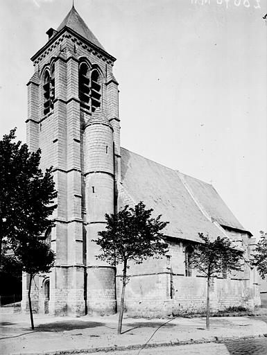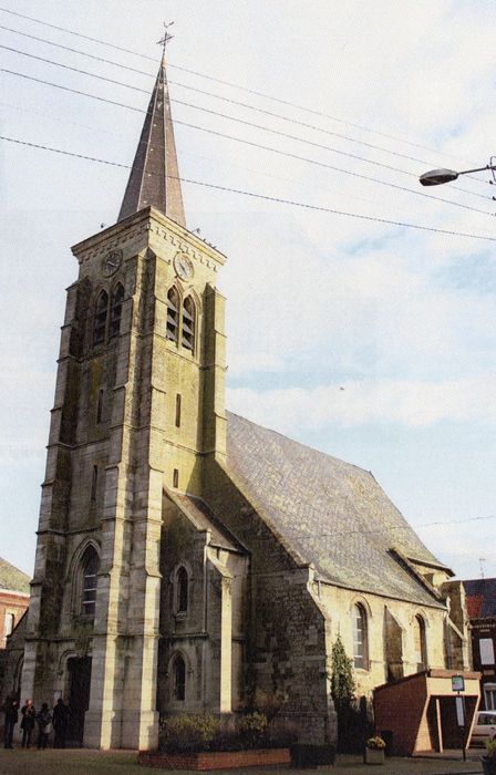 La paroisse apparaît dans les archives à la fin du 11e siècle. En 1546, l'ancien choeur est démoli. Les travaux sont achevés vers 1549. D'autres documents laissent penser que la reconstruction du choeur serait plus tardive. En 1595, la reconstruction est toujours nécessaire et effective en 1596. Des travaux sont menés au cours du 19e siècle. Des vitraux sont posés en 1869 par Courmont. Les deux guerres mondiales causent des dommages à l'édifice. L'église se compose d'une tour quadrangulaire de façade, d'une nef et d'un chevet polygonal à sept pans. Soutenue de contreforts plats sur trois faces, la tour est flanquée de deux bâtiments en appentis et surmontée d'une flèche octogonale en ardoise. A l'intérieur, des baies présentent des décorations flamboyantes. Voûtes d'ogives à liernes et tiercerons dont la bichromie est créée par le contraste des nervures en pierre et des voûtains en brique.