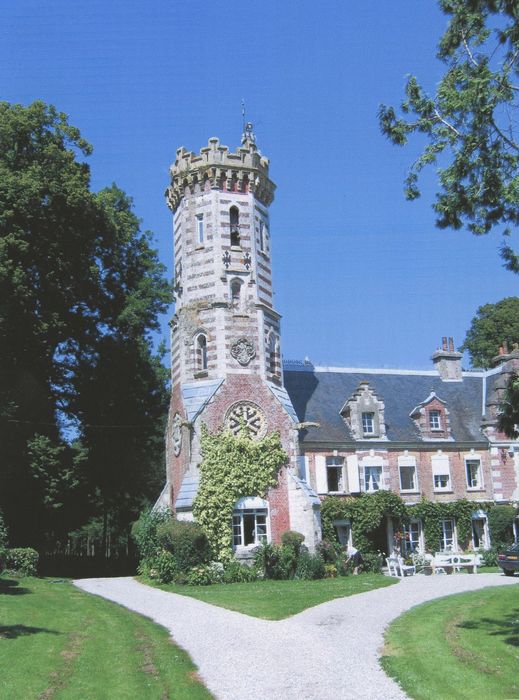 Construit en 1727 par le baron de Torcy, le château fut remanié dans le style néo-gothique anglais par l'architecte parisien Pierre-Charles Dusillon vers 1857-60. Un parc paysager est également aménagé à cette même période par l'architecte paysagiste Louis-Sulpice Varé. La tour du chevalier est érigé quinze ans plus tard. De l'ensemble architectural datant de 1727, ne demeure que l'aile sud transformée en château d'agrément, la ferme, transplantée au nord, étant rebâtie comme une ferme-modèle. La façade sud donnant sur le parc est flanquée de deux tours et comporte dix-huit travées. Une imposante travée abrite le perron sous un dais de style néo-Renaissance surmonté d'un pignon triangulaire. Le perron a, aujourd'hui, disparu. Une autre travée présente des cartouches mentionnant la date 1727. La toiture est en ardoises. La façade nord offre un aspect plus traditionnel : appareillage de briques et pierre de l'étage et corniche sous toiture en pierre blanche. La galerie est composée de six baies ouvragées. Une balustrade en fonte au motif gothique sépare le rez-de-chaussée et l'étage.££Un dessin datant de 1879 représente le chevalier de la tour avec son armure du haut de sa terrasse. Les éléments décoratifs architecturés sont également présents (rosace, gargouille, tête de maure) situant l'ensemble entre deux tendances : «gothic revival» et architecture néo-médiévale. Les décors intérieurs reflètent le mode de vie observé dans une demeure de campagne d'une famille aristocratique à cette époque. Les deux salons au rez-de-chaussée sont ornés de boiseries à motifs de guirlandes. La salle-à-manger possède un mobilier incorporé et des murs tendus de cuirs à l'imitation de Cordoue. Le vestibule s'ouvre sur le jardin. Le parc sert d'écrin au château et s'étend sur une quinzaine d'hectares en direction de l'étang, au sud. Au nord, devant la bâtisse, une prairie conduit à la ferme-modèle. Son agencement tend toujours à mettre en scène le château dans un jeu de perspectives et d'échappées visuelles.
