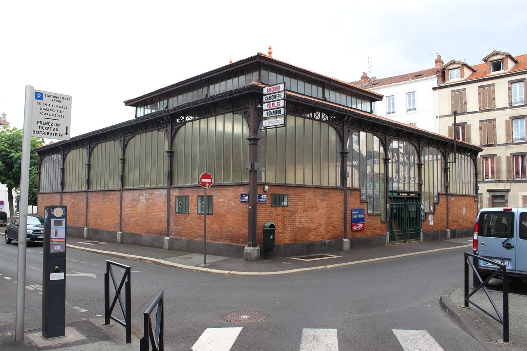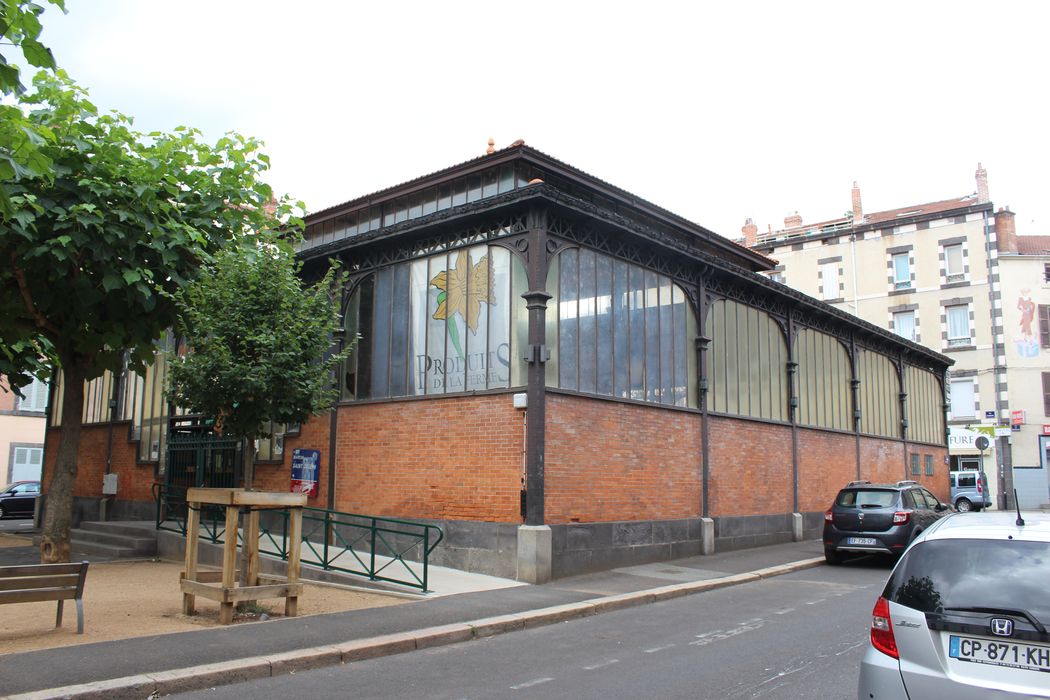 Ce marché couvert de style Baltard est un des derniers subsistants dans la région sans transformation majeure. Il a été construit en 1891-1892 par l'atelier de serrurerie André Michelin, un des frères fondateurs de l'usine Michelin. De plan carré avec un lanterneau central, il est entouré d'un mur de briques s'élevant à mi-hauteur de ses élévations. Il se situe sur une place parfaitement homogène par son architecture de la première moitié du 19e siècle.