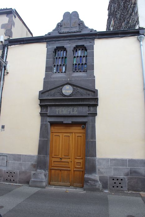 En 1862, la construction de la synagogue est due à la volonté de la communauté juive de Clermont de s'installer dans l'ancien quartier juif médiéval. L'aménagement d'une petite maison achetée à cette occasion fut confié à François-Louis Jarrier qui éleva une façade presque aveugle comportant une travée centrale architecturée en pierre de Volvic, composée d'un portail à fronton dont l'entablement porte l'inscription "Temple". L'intérieur a perdu ses aménagements lors du déplacement du lieu de culte dans un immeuble de la rue Blatin, en 1966, puis de la cession de l'édifice en 1978 à une loge maçonnique.