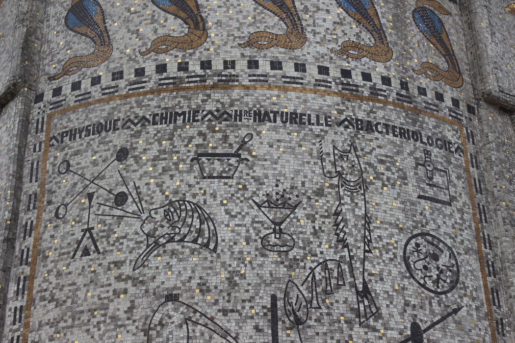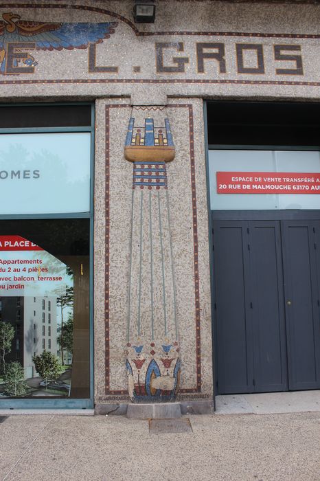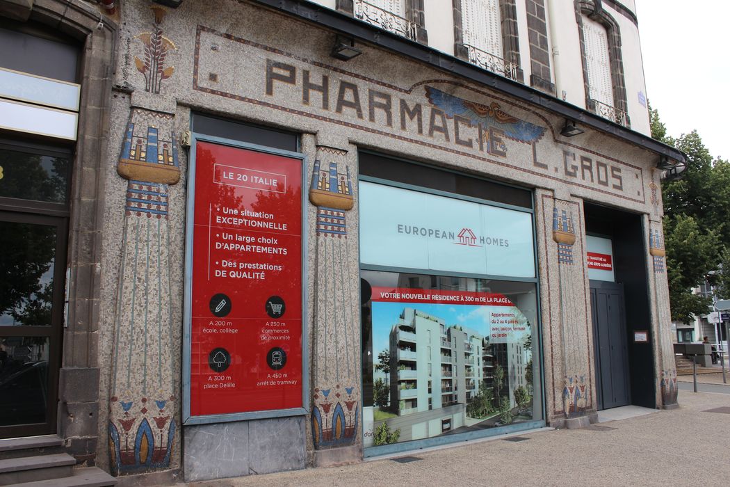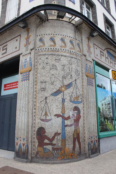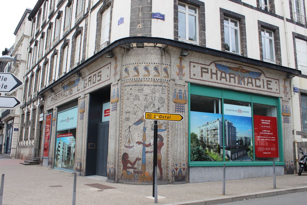Léon Gros, professeur à l'Ecole de médecine et de pharmacie de Clermont-Ferrand, propriétaire depuis le début du XXe siècle d'une pharmacie place Delille, était également passionné par la civilisation égyptienne. Il demanda en 1921 à son ami l'architecte clermontois Louis Jarrier (1862-1932) de concevoir pour sa pharmacie une devanture à l'égyptienne. Jarrier fit notamment appel aux mosaïstes Gentil et Bourdet.