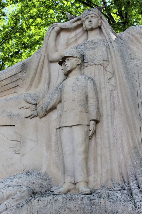 L'ensemble sculpté, réalisé en pierre calcaire, présente une allégorie de la Victoire aux ailes déployées qui abrite dans son manteau deux enfants de l'école militaire, debout devant un canon. Le corps d'un jeune soldat est allongé à leurs pieds face contre terre. La Victoire, vêtue à l'antique d'une tunique, est représentée de face, le visage aux traits figés et à l'expression hiératique. Son bras droit soutient au-dessus des enfants le long voile qui lui couvre la tête et le corps. Les enfants, placés l'un derrière l'autre de face, sont vêtus de leur uniforme. Leur visage est celui d'enfants, mais durci par une expression sévère. Dans un geste de salutation, leur bras droit est tendu au-dessus du corps allongé face.