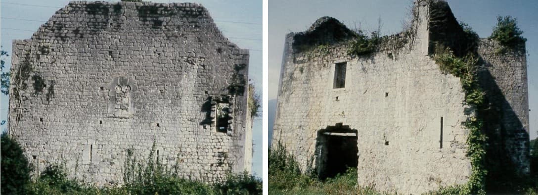 La maison-forte, bâtie au 13e siècle ou au début du 14e siècle, se dresse à l'écart sur un petit escarpement rocheux, au sud du village, et domine le paysage environnant. Prise et incendiée en 1569 par les troupes huguenottes de Montgomery, elle ne se releva semble-t-il jamais véritablement de ce désastre.