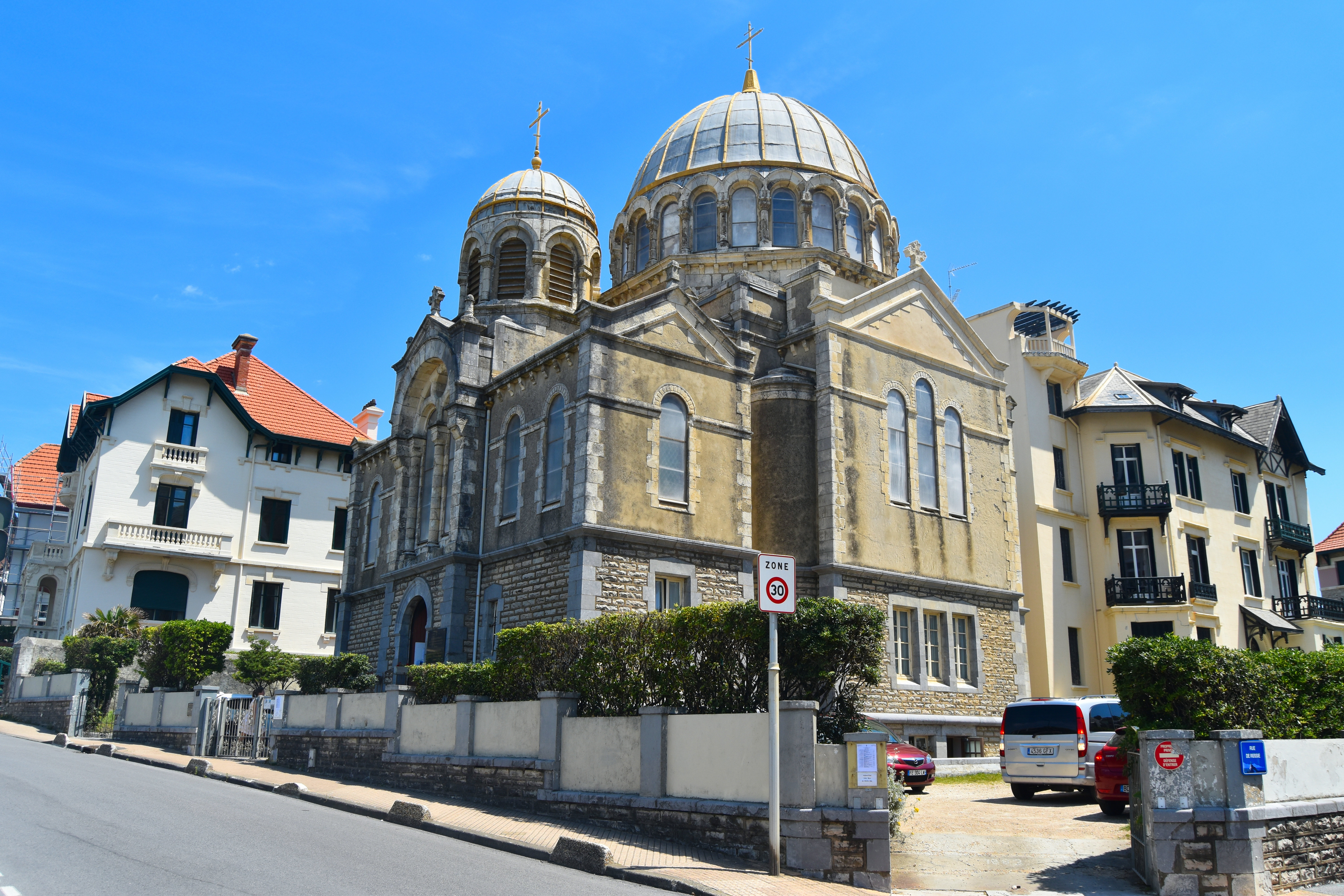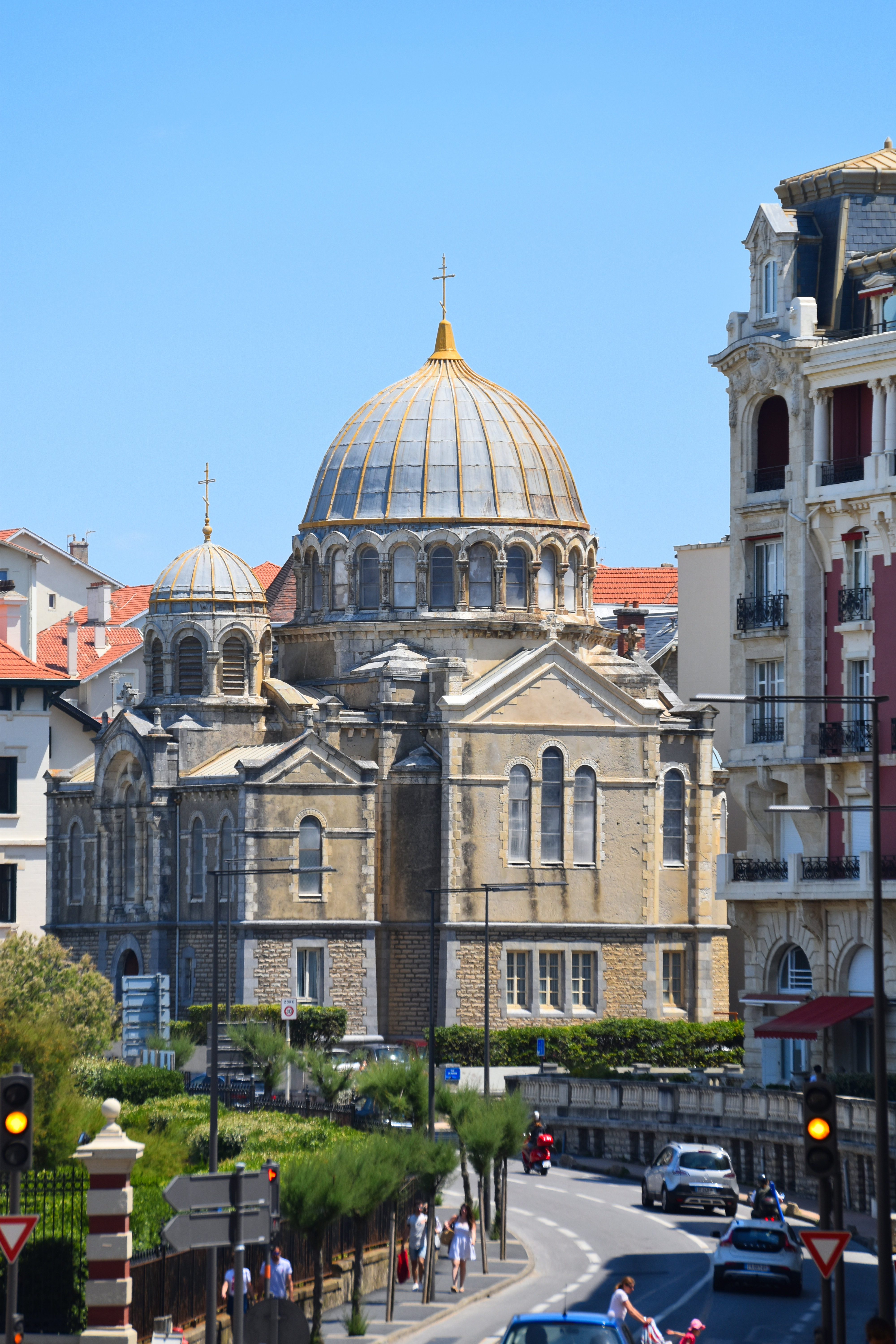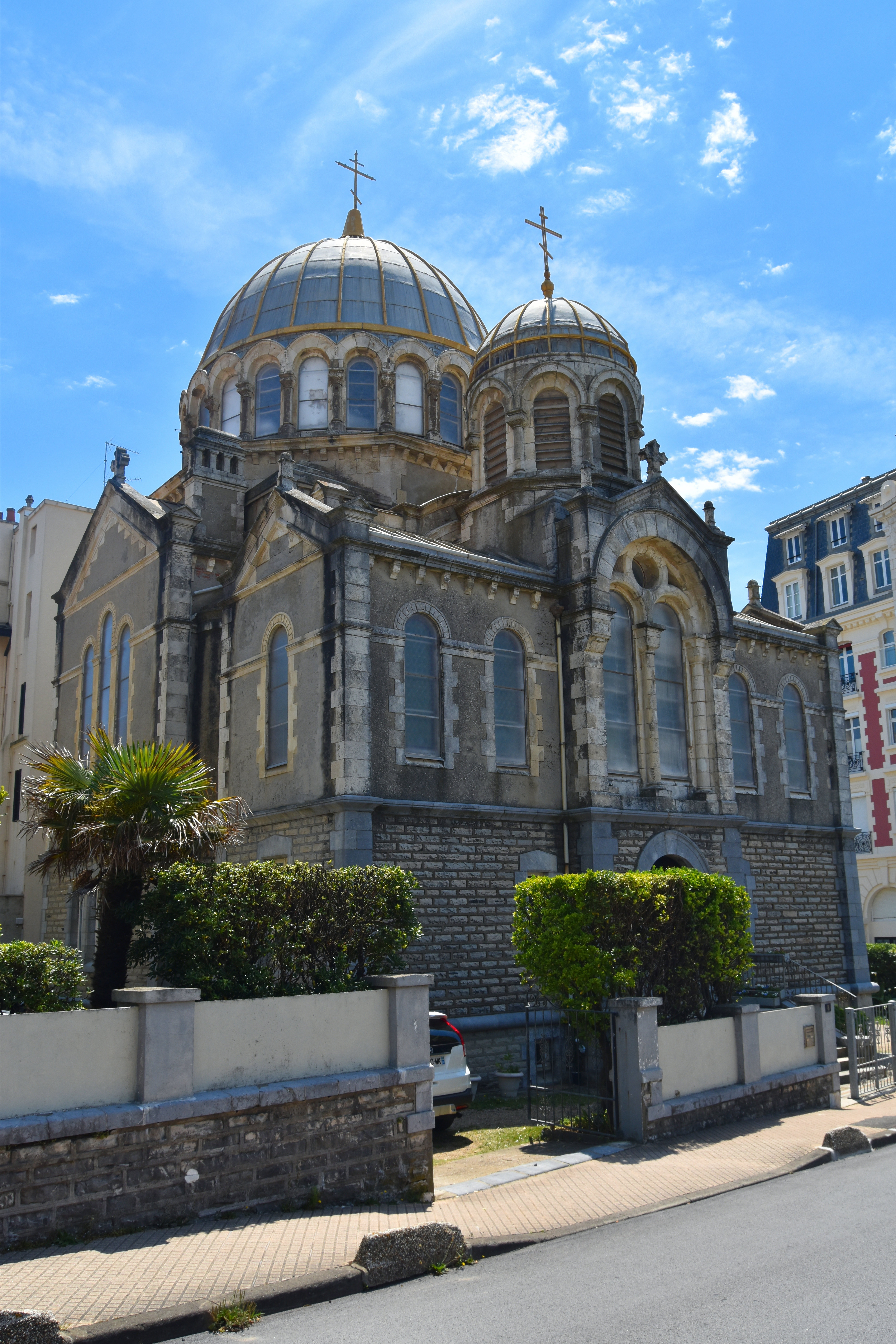 Placée sous le double vocable de la Protection-de-la-Mère-de-Dieu et d'Alexandre-Nevski, l'église, consacrée en 1892, rappelle la vocation cosmopolite de la station balnéaire très fréquentée par l'aristocratie russe tout au long de la seconde moitié du 19e siècle et du début du 20ème siècle. L'édifice, de plan centé, adopte le style « romano-byzantin » fort prisé par les architectes de la fin du 19e siècle. Bien qu'une certaine sobriété caractérise l'architecture des façades, le jeu des volumes de toitures dominés par la coupole centrale confère au monument toute son ampleur. La décoration intérieure mêle des éléments propres au culte orthodoxe à d'autres, plus usuels, liés au savoir-faire local, tels les vitraux géométriques de Mauméjean.