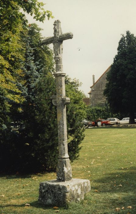 La croix du 15e siècle est située dans le parc du château de Bellecroix, ancienne commanderie de l'ordre de Malte, dont le commandeur était Bernard Pot, frère du sénéchal des Ducs de Bourgogne. Il aurait fait élever cette croix en hommage à la Vierge pour la délivrance de son frère Philippe, prisonnier des Turcs. Cette croix, qui n'a jamais changé de place depuis son érection, est en pierre calcaire ; elle comprend une base carrée sur laquelle s'élève un fût de section octogonale ; sur la croix sont figurés le Christ, sculpté en ronde-bosse, et sur l'autre face, la Vierge debout tenant l'Enfant sur son bras gauche.