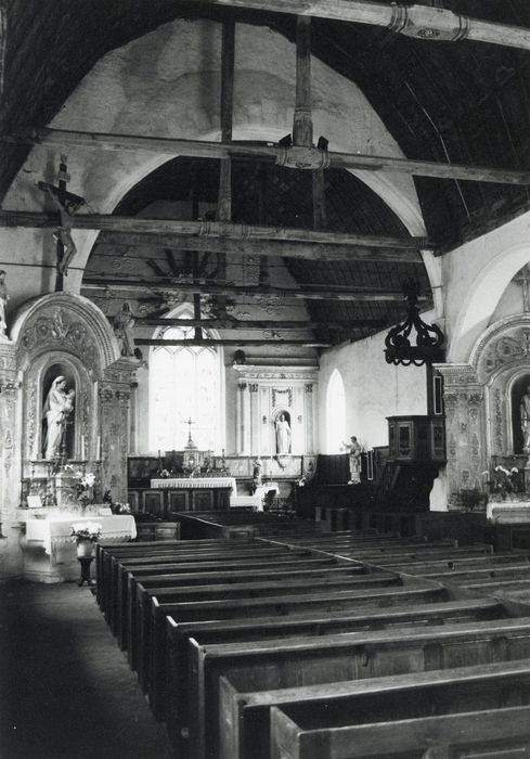 Eglise d'époque romane (tour-clocher et parties basses de la nef) , agrandie par l'adjonction d'un collatéral au 16e siècle. Lambris de la charpente (avec décor peint) refait en 1634.