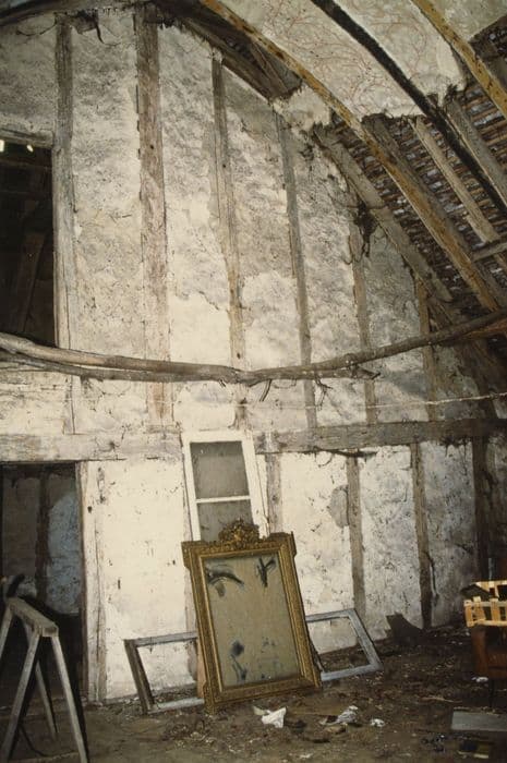 Le manoir de Mirebeau se trouve à quelques distances de la gare de Beaumont, sur les basses terres bordant le cours de la Sarthe. L'ensemble occupait au 18e siècle un emplacement délimité au Nord et à l'Est par un ruisseau qui formait douve et qui est toujours partiellement en eau de nos jours. Le plan de 1785 fait état d'un ensemble de bâtiments avec un corps de logis en équerre précédé d'une cour dont l'entrée est encadrée par deux corps de bâtiment presque parallèles, celui de gauche étant accoté d'un four au Nord. A l'Ouest se trouvent deux parcelles (205 et 206) correspondant sans doute à un verger et une basse-cour ; sur la parcelle 205 est indiquée en pointillés l'ancienne fuie démolie en 1776. Le manoir comprenait, si l'on se réfère à la montrée de 1771, le corps actuellement subsistant et, en retour d'équerre, des dépendances pour les bêtes et les remises, qui subsistaient encore en 1836 d'après le cadastre. Actuellement, il ne reste que la partie d'habitation. Il s'agit d'un corps de logis de modestes dimensions de plan rectangulaire de deux travées couvert par un toit de pente moyenne en tuile plate. Il est flanqué au Nord par une annexe en appentis contenant le fournil. Ce corps de bâtiment se divise en deux niveaux : au rez-de-chaussée, un niveau bas couvert par un plancher divisé à l'origine en deux : une pièce à usage domestique, séparée par une cloison en pan-de-bois (disparue) d'un corridor transversal conduisant dans le fournil ; à l'étage, une salle sous comble couverte par une charpente plafonnée en torchis, séparée par une cloison en pan-de-bois d'une petite chambre surmontée d'un grenier en demi-niveau. A l'origine, on accédait à l'étage par un escalier transversal dont la volée montait probablement de l'autre côté du mur de refend, aujourd'hui disparu ainsi que le corps de bâtiment en retour. Il débouchait probablement dans la petite chambre par une porte médiane aujourd'hui obturée ; après la disparition de cet escalier, qui remonte à une date antérieure à 1771, on a supprimé la cloison de pan-de-bois séparant la pièce basse du corridor et construit un escalier tournant sur mur d'échiffre grossièrement monté et arrivant au seuil de la salle de l'étage supérieur, escalier dont la trémie prend sur la surface de la petite chambre. Le logis est éclairé au rez-de-chaussée par une baie modifiée à une époque récente mais qui conserve sa plate-bande de couvrement, et par un petit jour à châssis ouvrant pratiqué dans le pignon à gauche de la cheminée, et à l'étage par deux fenêtres passant-en-lucarne dont le gâble a malheureusement été mutilé. L'intérieur de la maison conserve, malgré quelques lacunes, un important décor peint en partie masqué par les badigeons successifs. Au niveau bas, on distingue un décor de petits rinceaux peints à l'ocre rouge sur l'ébrasement de la fenêtre, ainsi qu'un décor de petits traits posés en bande sur le manteau de la cheminée, alternativement jaune et rouge. A l'étage, la salle est entièrement recouverte de décor peint. L'ossature du pan-de-bois et de la charpente à chevrons-portant-ferme avec sous-faîtage, chevrons, aisseliers et jambettes courbes sont alternativement peints en rouge, jaune et noir ; le hourdis du plafonnement de la charpente est recouvert d'un badigeon au lait de chaux blanc orné de branches d'arbres à l'ocre rouge à feuilles de chêne ou de laurier à l'ocre jaune ou au blanc et de petites baies au tampon ; la cheminée est peinte en alternance à l'ocre rouge et jaune selon les faces de la mouluration des piédroits et chapiteaux, et la hotte, recouverte d'une épaisse couche de lait de chaux, semble entièrement peinte d'un échiqueté rouge et blanc. Il ne semble pas qu'il y ait eu de décor dans la petite chambre contiguë.