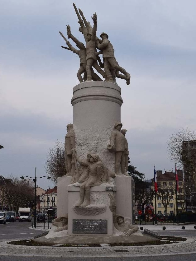 Ce monument à « la Victoire » représente de manière réaliste les soldats : les poilus émergeant des tranchées au pied du spectateur, les quatre armes au sommet du fût, ainsi que des soldats alternant avec deux groupes assis. L'artillerie et l'armée de l'air sont représentées chacune par deux soldats avec des attributs spécifiques (fusil, hélice) ; entre eux sont intercalés deux groupes assis au pied du fût : l'Alsace et la Lorraine d'un côté et la Savoie soutenant un soldat blessé de l'autre.
