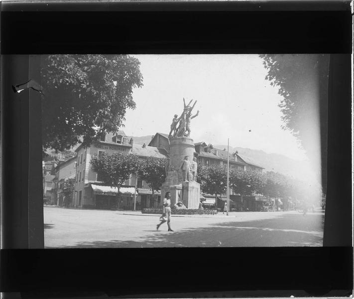 "Le monument d'Aix-les-Bains est un des plus connus et publiés (par le service de l'Inventaire et l'archiviste municipal J. Lagrange) de la région. Dû également à A. Boucher (1922), il se compose d'un fût surmonté d'un groupe de soldats et de figures placées debout ou assises et appuyées sur ce support. Des poilus émergent du sol dans la partie inférieure du monument. Il est localisé square A. Boucher, dans un lieu d'entrée dans la ville, très passant. Il adopte une même technique de modelage sur ciment dont Boucher a laissé plusieurs témoignages à Aix.