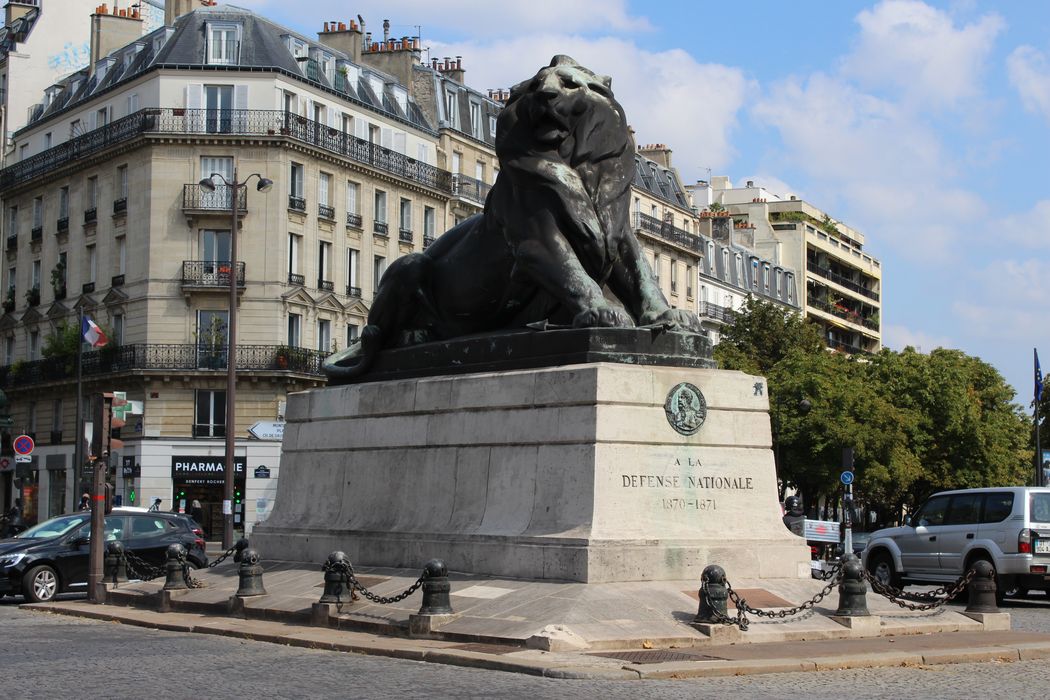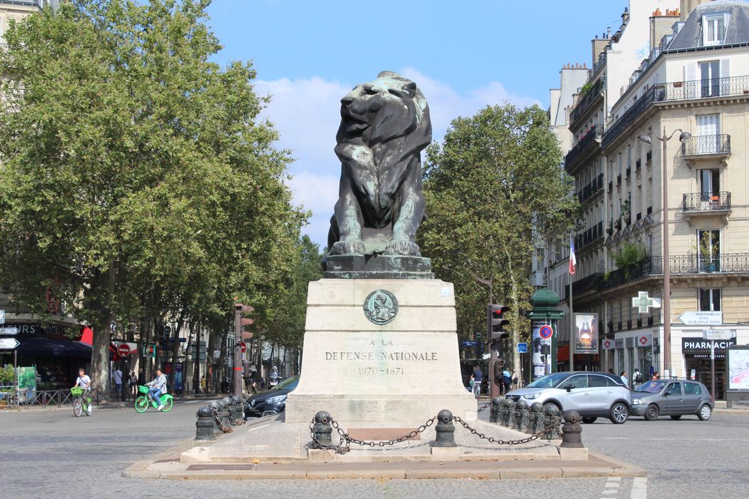 Lion édifié à la mémoire du colonel Denfert-Rochereau, défenseur de Belfort durant la guerre franco-prussienne. Sculpté par Bartholdi, l'artiste en présente un modèle en plâtre au Salon de 1878, acheté par la ville de Paris. Lion en plaques de cuivre repoussé, haut de quatre mètres sur sept de long. Un médaillon en bronze à l'effigie du colonel est ajouté en 1920. L'actuel médaillon est une substitution datant de 1979. Le lion est inauguré en 1880.