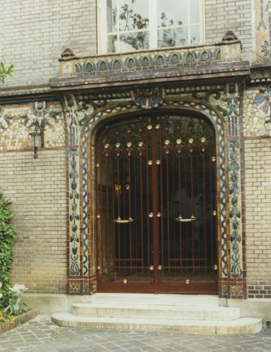 Immeuble situé en plein coeur de la villa des Ternes, construit entre 1911 et 1913 par les architectes Louis Chauvet et Maurice Coulomb. Façades extérieures et quelques parties communes décorées par Alexandre Bigot : décor de grès flammé caractéristique des dernières années de l'Art Nouveau.