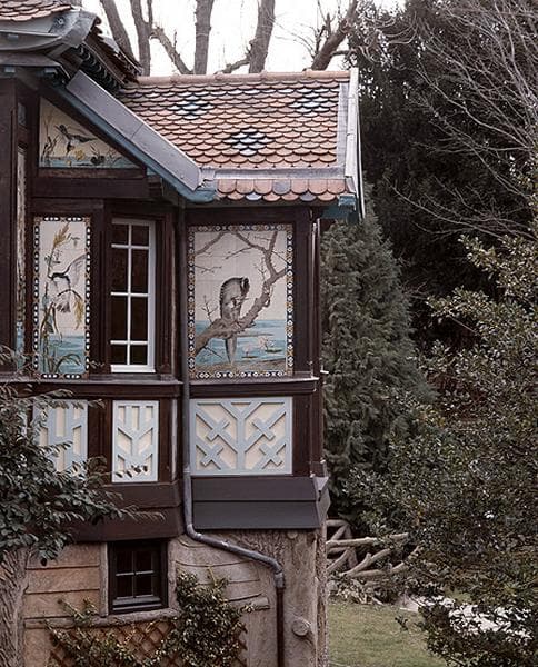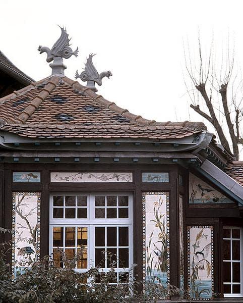 Accolé à une maison réalisée en 1880, ce pavillon proviendrait de l'Exposition universelle de 1900. Son décor se compose de panneaux en céramique signés H.Cannes et fabriqués par la manufacture Villeroy et Boch. Ces panneaux couvrent l'ensemble des façades en exploitant le thème classique du répertoire extrême-asiatique. De plan polygonal irrégulier, le pavillon a été remonté sur un soubassement rustique en ciment armé gravé de branchages feints pour le faire communiquer de plain pied avec la salle à manger de la maison principale. Les intérieurs ont perdu l'essentiel de leur décor.