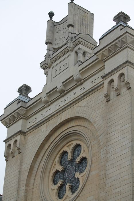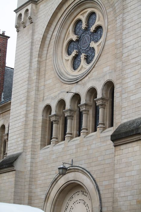 La synagogue de Versailles fut édifiée en 1884 selon les plans de l'architecte Alfred-Philibert Aldrophe et inaugurée en septembre 1886. Cet ensemble comprend le temple proprement dit et un immeuble attenant dans lequel se trouvent un petit oratoire et les appartements du rabbin et du ministre-officiant. De style néo-roman, l'édifice principal est dominé par un vitrail en forme de rosace qui occupe le milieu de la façade, flanquée de deux tours carrées et surmontée du rouleau de la Thora. A l'intérieur, le mobilier du temple est assez austère, contrairement à l'oratoire qui renferme l'Arche d'Alliance de style Renaissance et un pupitre en bois peint et doré