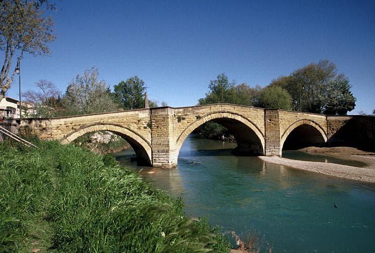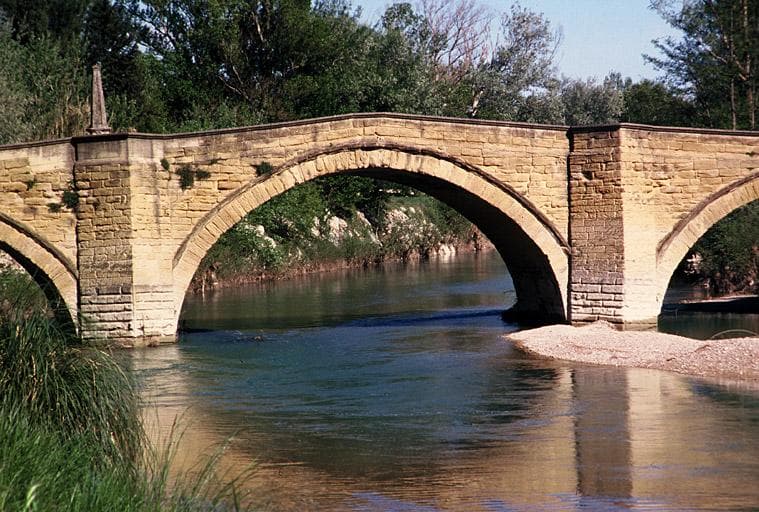 Pont bâti entre 1640 et 1644, enjambant la rivière par trois arches plein cintre soulignées par une archivolte. Les piles sont dotées de becs dont la base est animée par un appareil à bossages, réemplois d'un pont romain emporté par la crue de 1616. En 1713, une croix en pierre de Pernes fut érigée sur le pont. Les reprises des becs et du parapet pourraient être contemporaines de la mise en place de cette croix.