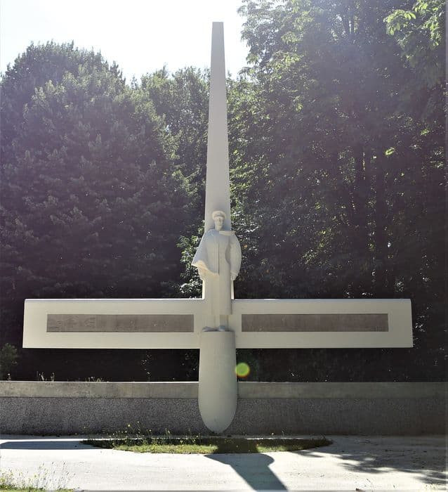 Il s'agit d'un monument commémoratif de l'aventure tragique qui a entraîné la disparition du commandant Guilbaud dans l'océan Arctique, en 1928. Il est constitué d'un socle allongé au centre duquel s'élève une sorte de mât portant une traverse et contre lequel est dressée, sur un socle, la statut du commandant dans son uniforme d'officier. Des allégories de la naissance du héros et de son épopée tragique sont sculptées en faible relief: à gauche de la statue, sa maison natale et la date de sa naissance, et, à droite, l'hydravion volant au-dessus de la mer et la date de sa disparition.