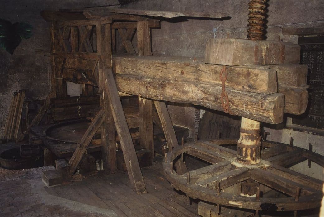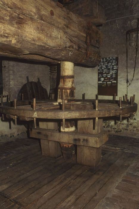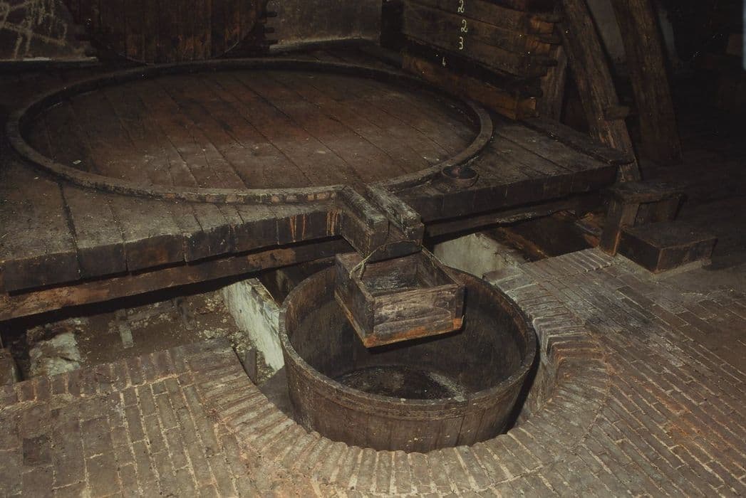 Pressoir à balancier construit en briques en chaînage harpé et rognons de silex. Il conserve quelques éléments du 14e siècle bien que reconstruit en grande partie au 18e siècle. Vers 1789, le pressoir a été déplacé et remonté dans la cuverie actuelle spécialement construite pour le recevoir.