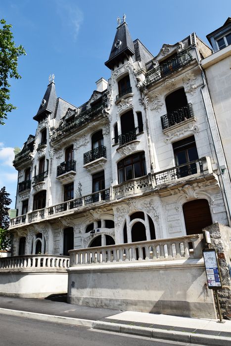 Cet immeuble de rapport, édifié en 1907 en utilisant le procédé de la pierre armée, s'élève sur un puissant soubassement couronné d'une balustrade et surmonté de deux étages percés de grandes baies et d'un étage en comble richement décoré d'une balustrade métallique. La façade présente deux avancées décorées de bas-reliefs évoquant l'art décoratif de la Belle Epoque et le style Art Nouveau.