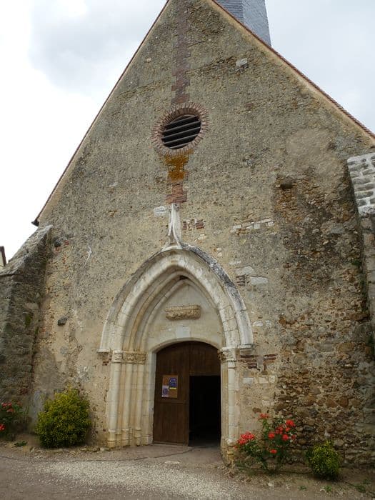 La fondation d'un lieu de culte chrétien remonte peut-être au 9e siècle. L'église du 13e siècle était enclose dans l'enceinte du château, tous deux détruits au cours de la guerre de Cent ans. L'édifice actuel date du 15e siècle. Abattu par un orage au 16e siècle, le clocher est reconstruit en 1835. L'église présente un unique vaisseau se terminant par un chevet à trois pans. Elle s'ouvre par un portail orné de voussures en ogive provenant de l'abbaye de Fontainejean. Une poutre de gloire portant trois statues des 15e-16e siècles, sépare la nef du choeur. Les murs s'ornent d'un décor peint daté du 19e siècle.