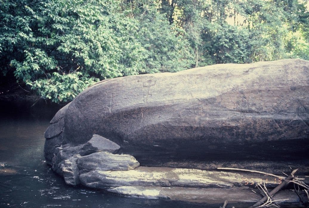 Le site présente deux ateliers de polissage et une roche gravée, et n'est visible qu'aux périodes d'eaux basses. La roche, découverte en 1941 par un médecin militaire, comporte six têtes frustres de la phase Amérindien 1, deux singes et un masque de la phase Amérindien 2.