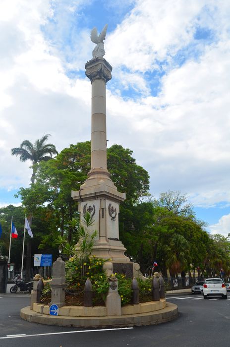 Un monument commémoratif, érigé grâce à une souscription lancée en 1918, est érigé au croisement des rues. Une grande colonne en granit surmontée d'un ange de marbre brandissant une couronne de lauriers, est posé sur un piédestal chanfreiné aux contreforts à volutes, ceinturé d'un emmarchement avec obus et palmes de bronze. Une urne, scellée dans le monument en 1941, renferme une parcelle de "terre française". Le monument est inauguré en 1923.