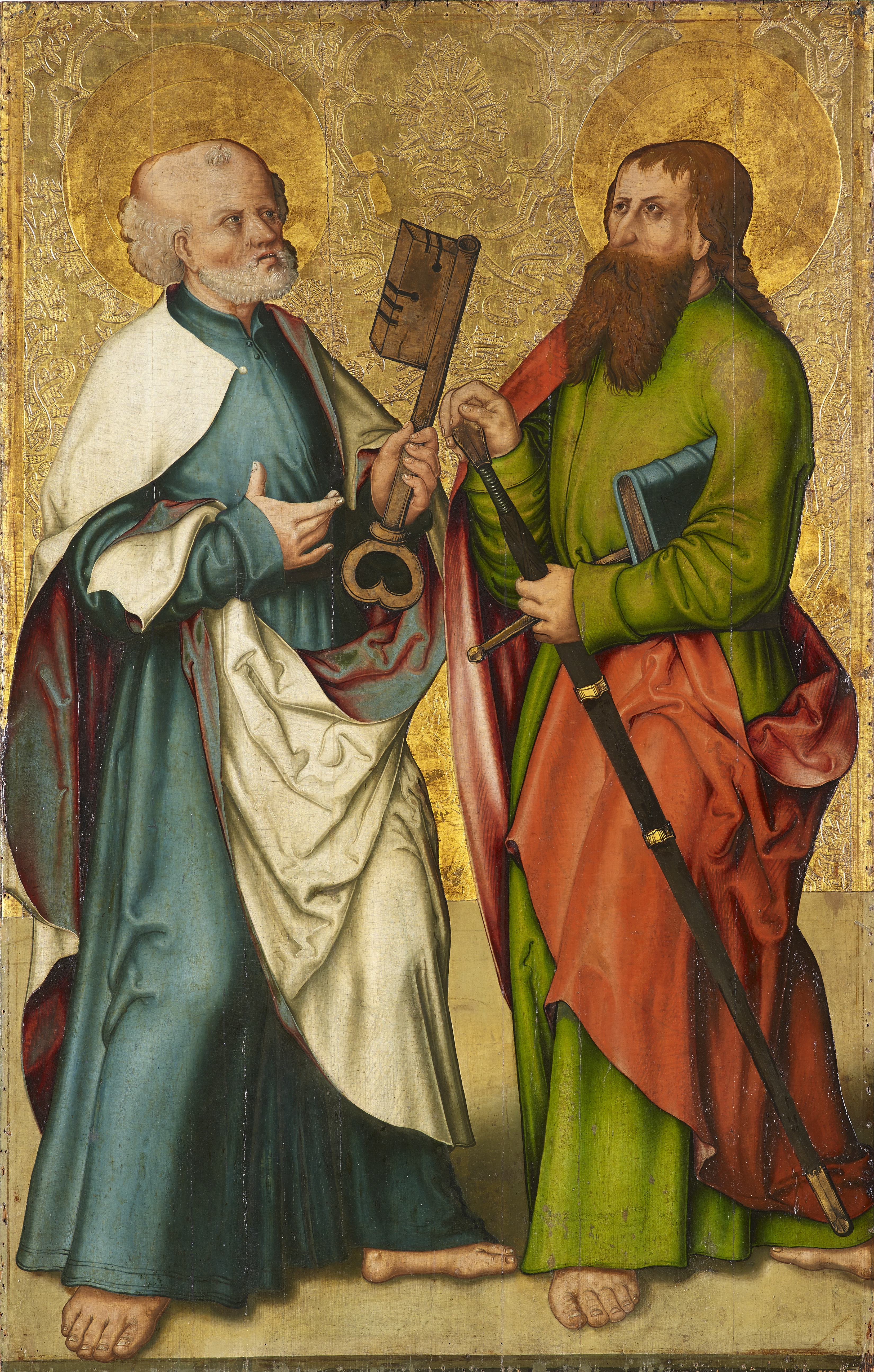figures bibliques (saint Pierre : debout, de profil, clé, saint Paul, debout, de profil, épée, livre, vêtement, effet de tissu)