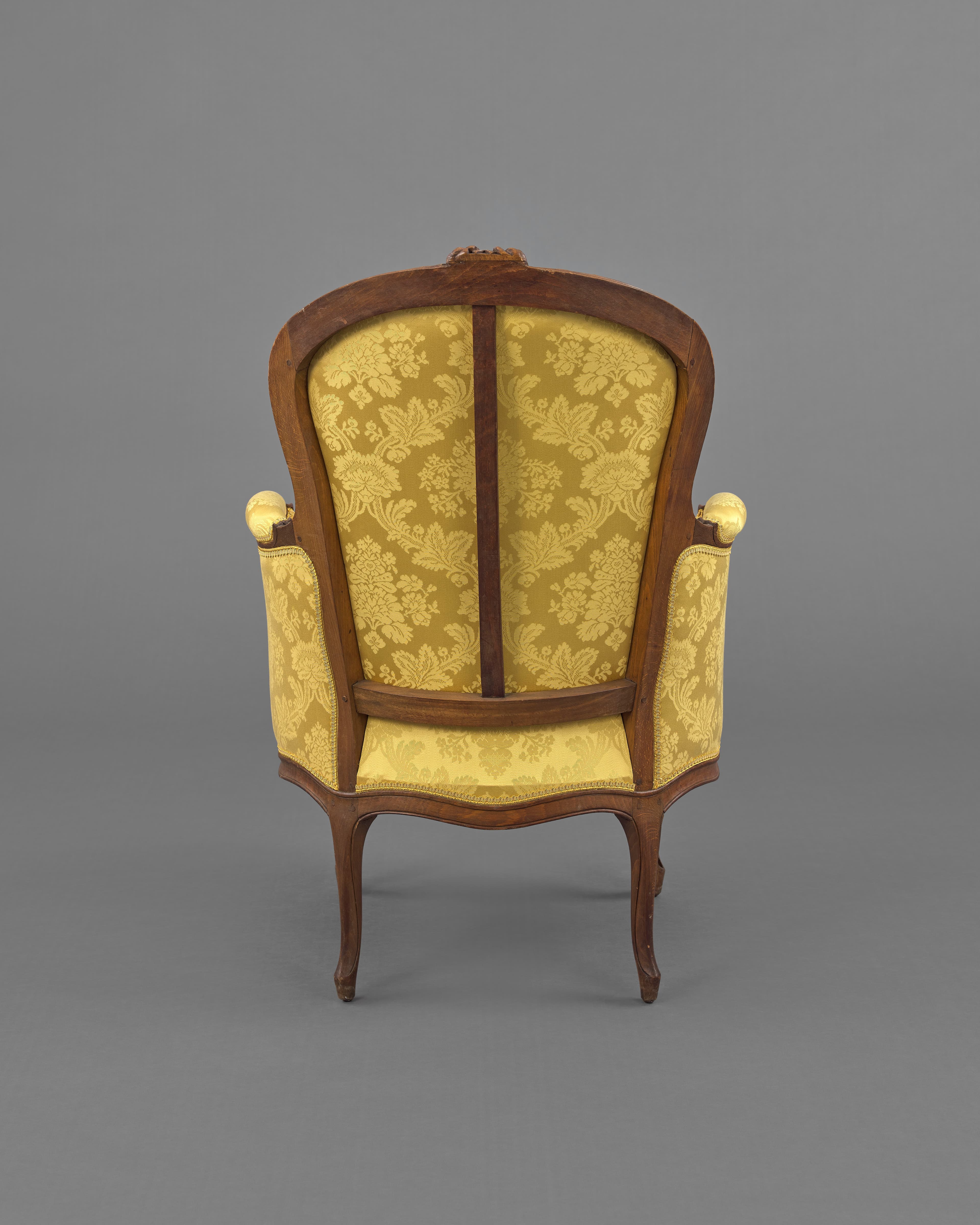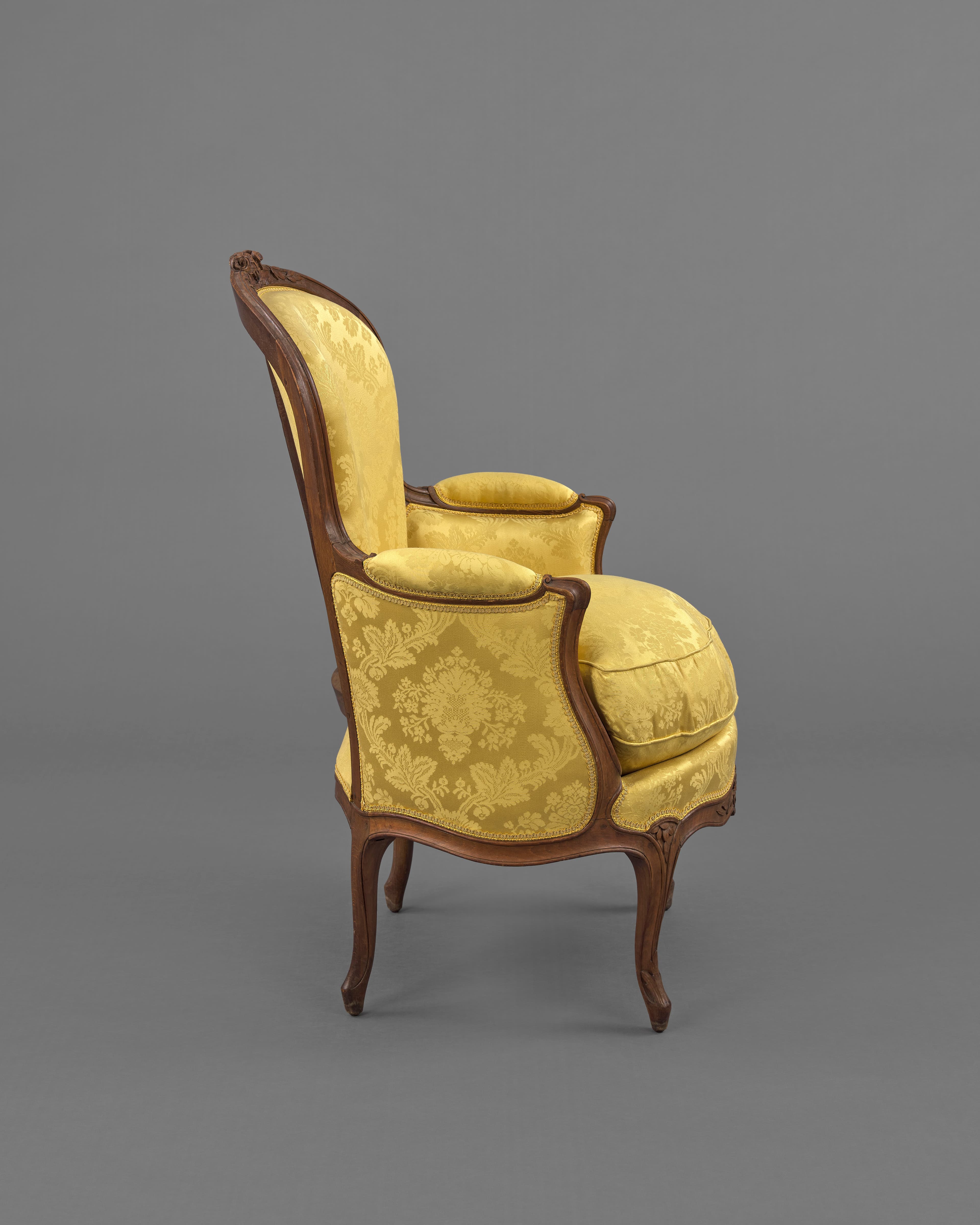 Bergère en cabriolet dont les pieds sont en forme de biche et dont les écoinçons sont décorés d'une fleur sculptée en relief qui se retrouve au milieu de la ceinture et du dossier, et d'une feuille d'acanthe stylisée. Recouverte à l'origine d'une soierie verte à fleurs et oiseaux, elle est actuellement tapissée d'une soierie jaune brochée.