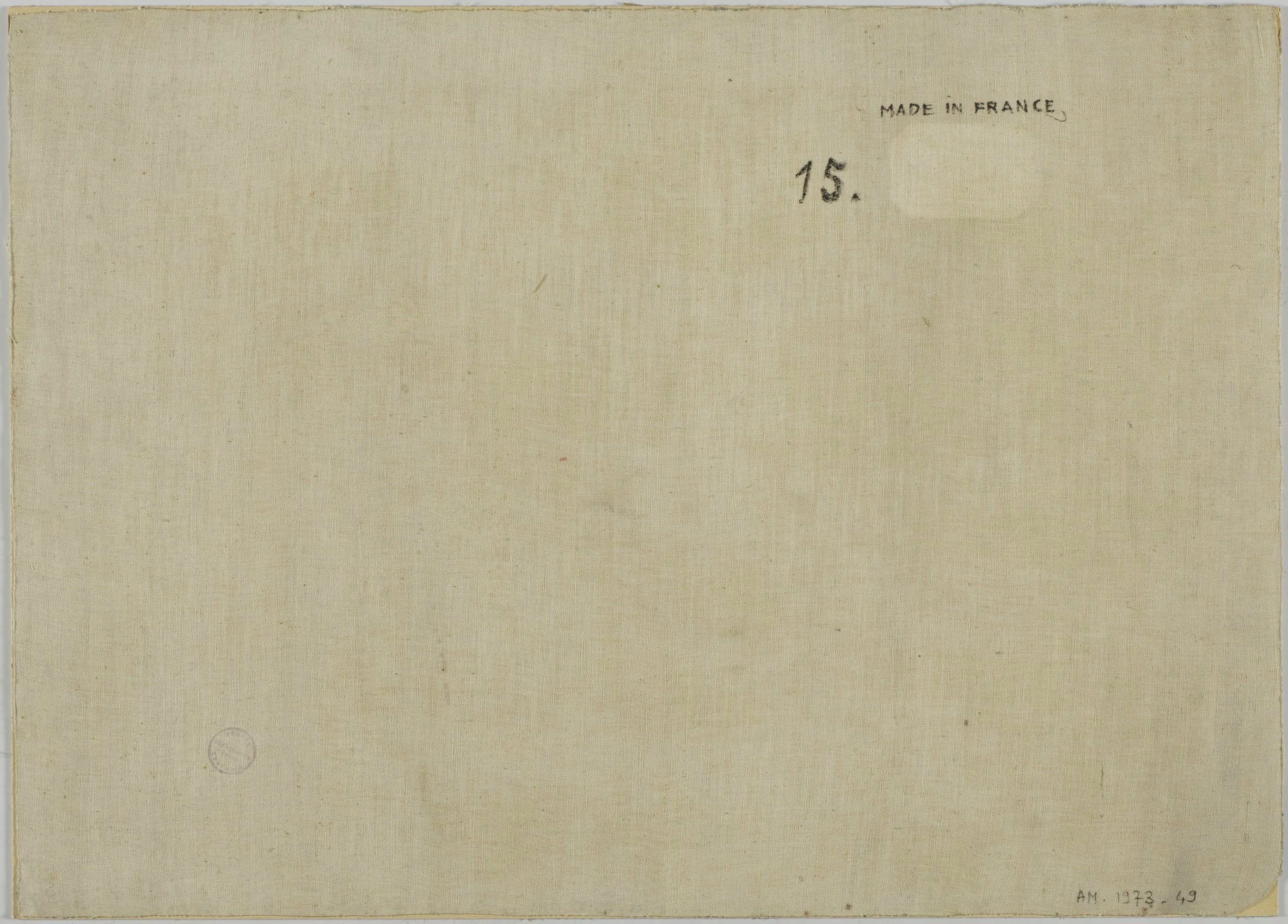 Au revers : "MADE IN FRANCE / 15" ; tampon en bas à gauche : "douane centrale exportation paris" ; trace d'une étiquette disparue sous le titre "AM 1973-49 ?/ R 26 P"