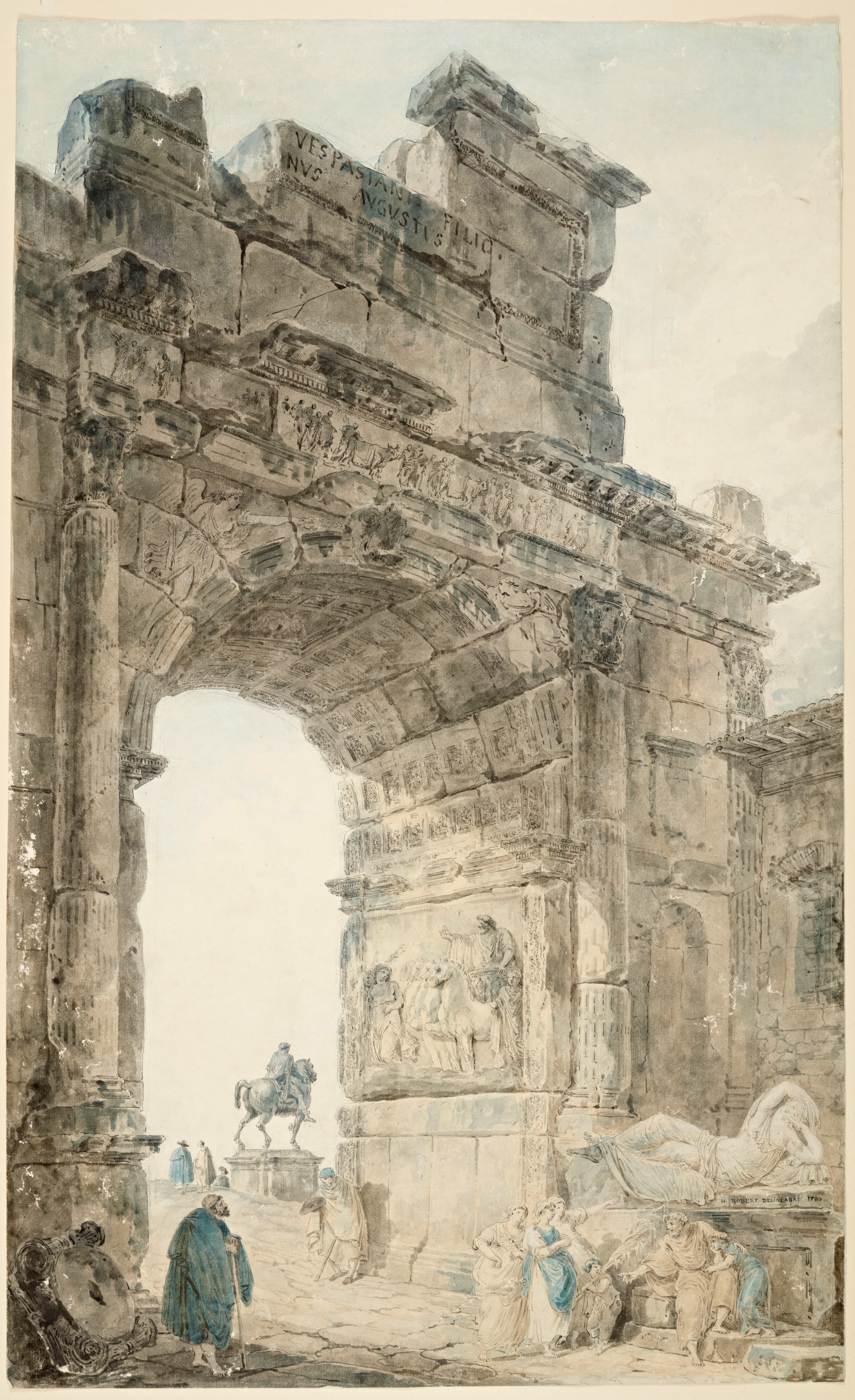 vue d'architecture (ruines : à l'antique, arc de triomphe, statue, frise, personnage, mendicité)